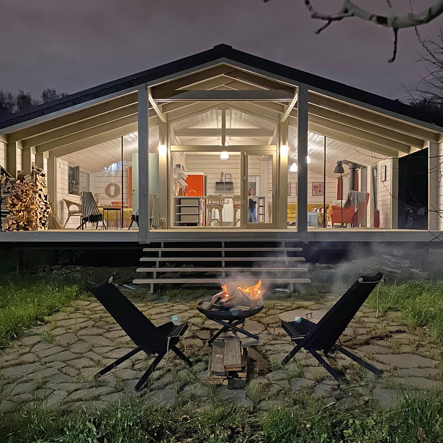 „Lákala nás dřevostavba s moderním designem a velkými prosklenými okny. Ke spolupráci jsme proto přizvali společnost DublDom, jejich nabídka modulových domů byla pro nás jasná volba. Spolupráce s nimi probíhala perfektně a do teď si je můžeme jenom vynachválit. První rodinný dům o celkové velikosti 75 m2 včetně terasy byl postavený za 6 měsíců a složený na pozemku během 4 dnů. Neuvěřitelné,“ pochvaluje si Vlaďka spolupráci. „Stojí na pilotech o výšce až 1,7m nad zemí, ale je plně zateplený včetně krbových kamen a slouží k celoročnímu ubytování. Pojmenovali jsme ho Buddha Home a sami v něm vyzkoušeli bydlet půl roku přes zimní měsíce, abychom vychytali případné mouchy a mohli u toho dokončit další část pozemku.“ Veškeré zemní práce včetně přípojek a terénních úprav si majitelé stavěli svépomocí. „Já jsme tou dobou byla v 6 měsíci těhotenství a měla na starosti veškerou komunikaci s dodavateli a fungovala jako hlavní dovozce materiálu na pozemek. Manžel Ash který pochází z Himalájí odložil obor softwarového inženýrství na háček, nasadil rukavice a dva roky je nesundal. Design interiérů jsem projektovala já a Ash následně vše skládal dohromady. Veškeré dekorace včetně houpacích sítí jsou dovezené ze společných cest po světě, a to především z Bali, Kolumbie, Kostariky a Indie.“