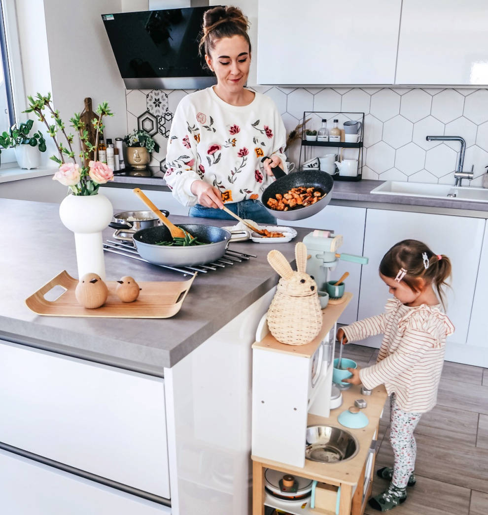 Patro je soukromé a tišší, kromě rodičovské ložnice se sem vešel pokojík Terezky, pracovna a velká relaxační koupelna s nádherným výhledem do zahrady. „Vymýšlet a zařizovat interiér mě neskutečně baví. Když se mi povede dát dohromady prostor, který je nejen pěkný, ale i funkční, je to dvojnásobná radost! Snažím se sledovat trendy, po inspiraci pátrám na Pinterestu a Instagramu, interiér pořád měním a oživuju, což doporučuju, skvěle to zabírá proti stereotypu všeho druhu. Mám ráda designové doplňky, baví mě je kombinovat s dostupnějšími kousky. Nemyslím si, že by na tom bylo něco špatného, naopak, je to osvobozující pocit říct si: ‚Proč ne?!‘ Mezi mé oblíbené obchody patří Bella Rose, Milky, H & M Home, Westwing, ze značek mám slabost pro Kahler, Ferm Living a Muuto. Ze všeho nejvíc miluju kuchyni. Snažila jsem se do ní vložit srdce a snad je to, doufám, znát,“ říká blogerka. Kombinací světlého dřeva s jemnými odstíny šedé, béžové, hnědé, DIY doplňky, se spoustou textilu a vlastní intuicí s originálními nápady natočila svůj domov lehce k severu, aniž by moc tlačila na pilu. A že by se na dvorku jedna určitě našla… „Vždycky se mi líbil skandinávský design, jeho přímočarost a hravost, čisté nadčasové interiéry, které vás chytnou za srdce milými detaily a všeho je přesně tak akorát. A o to se u nás doma snažím. Nedávno jsem dodělala Terezce pokojík a plna obav jsem se ptala sama sebe: bude vůbec takhle malá holčička schopná vyjádřit, jestli se jí to líbí, nebo ne? Prohlédla si ho a přiběhla za mnou se slovy: ‚Maminko, udělala jsi mi to tu krásné, moc tě miluju.‘ Spadla mi brada… Kdo by chtěl víc?“