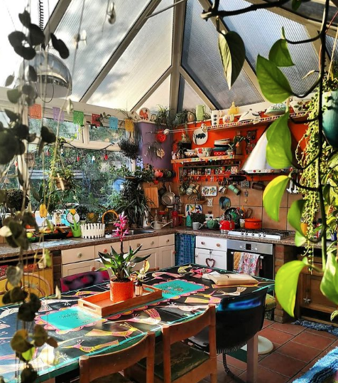 „V tomto domě bydlíme už sedm let. Vždycky jsem milovala barvy a dekorace. Mou největší láskou je pletení. Právě proto je můj domov plný barev a rozmanitých textur. Vtipné je, že můj manžel je slepý, takže je k mým barevným výstřelkům tolerantní,“ směje se Kathryn, která je milovnicí pokojových rostlin, kterých má doma úctyhodný počet. „Když jedeme na dovolenou, musím spoléhat na naše teenagery, aby je všechny zalili. „Vždycky jsem se snažila pořizovat věci levně, nebo zadarmo. Většina mého nábytku je z druhé ruky, nebo mi ho někdo dal. Také ráda podporuji nezávislé umělce, pokud je to možné, když zrovna sama nějaké dekorace nebo obrazy nemaluji,“ uzavírá Kathryn.