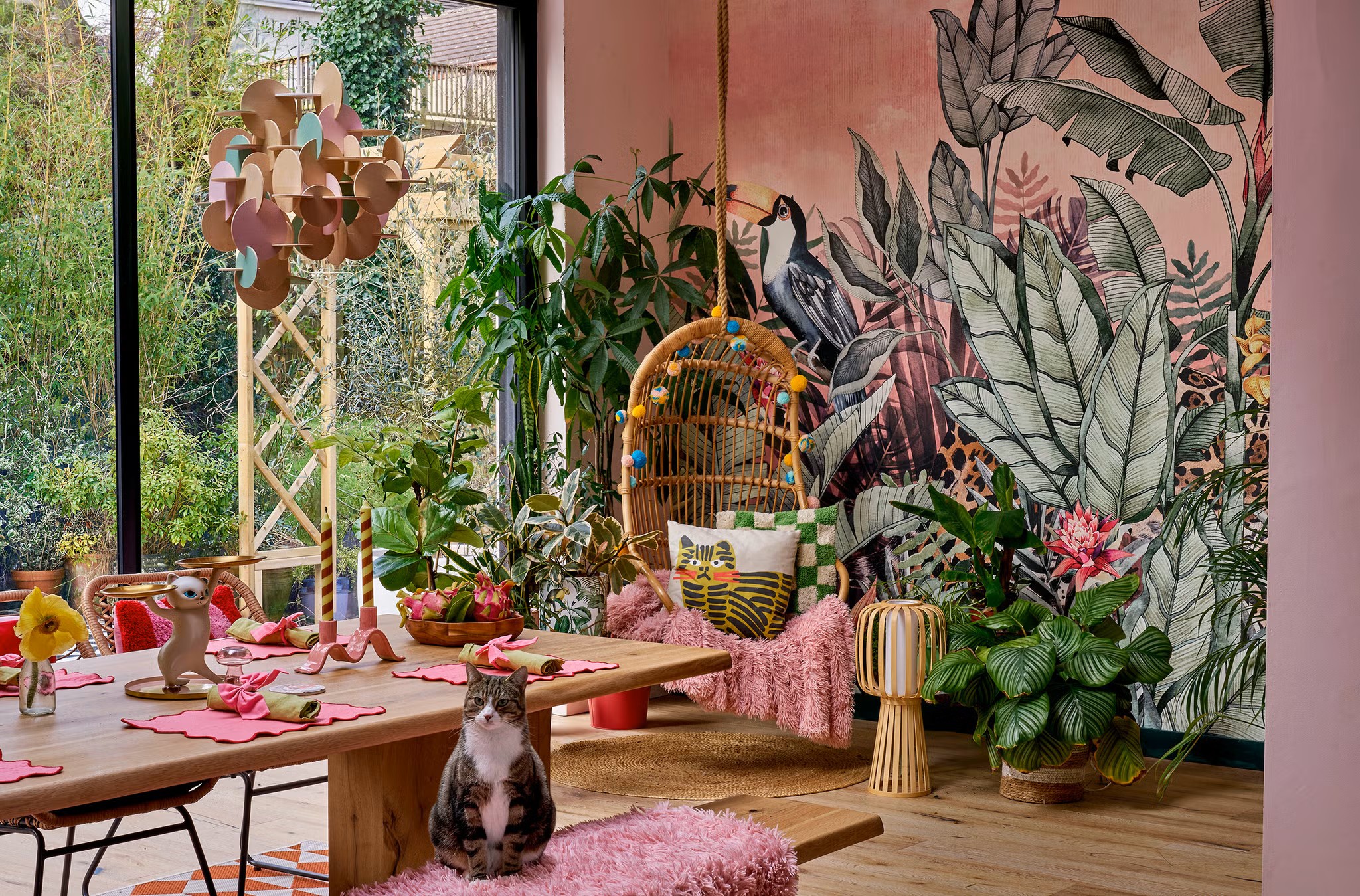 Další úchvatný moment zažijete při pohledu na fototapetu s jaguárem plížícím se listnatou džunglí. Teno obraz nejdříve akvarelem namalovala její kamarádka, umělkyně Hazel Carruthersová. Nad jídelním stolem je nápadná dekorace z propletených kruhů, které Kim-Joy sama sestavila, ovšem předtím některé z nich natřela na růžovo a tyrkysově modrou. Dalším důležitým prvkem procesu návrhu bylo osvětlení, protože mladá žena trpí chronickými migrénami a je velmi citlivá na změny prostředí. Jasné ranní světlo bylo v kuchyni zmírněno světlými bambusovými stěnami a v celém domě jsou umístěné žárovky v teplých tónech. Stejně jako zbytek domu i ložnice v patře jsou barevné a živé. V pokoji pro hosty byste místo čela u postele našli výraznou růžově a hnědě pruhovanou stěnu. „U každého kutilského projektu si říkám: Tohle zabere jeden den. Pak to trvá několik dní.“ Zvláštní pozornost věnuje Kim-Joy detailům dotvářejícím atmosféru celého prostoru. Ať už je to keramika, nádobí, svícínky, pohlednice nebo knihy. Stále ale není hotovo a když se rozhlédne kolem sebe, vidí, co všechno by ještě chtěla upravit: natřít radiátory, vyměnit kliky atd. „Pořád je toho spousta co dělat, ale to je to, co miluji. Vždycky je zábava mít projekty, na kterých můžu pracovat.“ I když by se na první pohled mohlo zdát, že je to celé spíš dekorace než funkční bydlení, opak je pravdou. Dům je plný života, radosti, vůně pečeného chleba a měkkých barevných textilií lákajících k zachumlání.