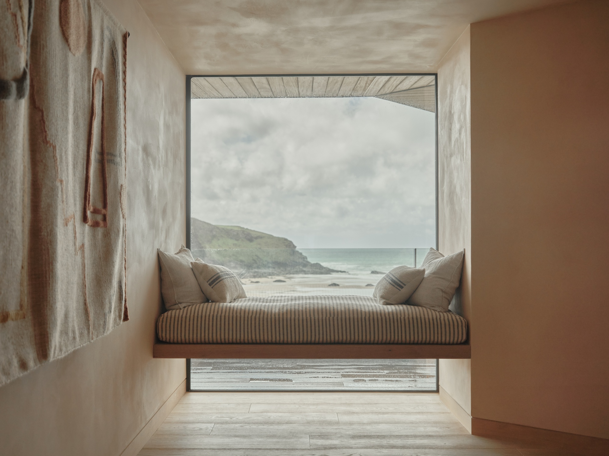 Interiér naopak odhaluje rozsáhlé rodinné zázemí, navržené tak, aby co nejlépe rámovalo výhledy na oceán. Přízemí tvoří posloupnost společenských prostor – obývací pokoj plynule navazuje na rodinnou kuchyni a jídelnu, odkud lze přejít do dětského herního pokoje, vitality bazénu i pečlivě vyřešeného zázemí pro surfery se sušárnou. Dominantou dispozice je dramatické zakřivené dřevěné schodiště pod kruhovým střešním světlíkem, který přivádí denní světlo hluboko do domu a umožňuje přirozené větrání v létě. Materiálové řešení s důrazem na dřevo, kámen a omítku z cornwallské hlíny vytváří teplé a přirozené prostředí, které je elegantní, ale přitom neokázalé. Architekti zároveň zachovali původní terasovitou zahradu, kterou předchozí majitel budoval dlouhá léta ručně kladenými kamennými zídkami a cestičkami. Celý projekt stojí na udržitelných principech – od prefabrikované CLT konstrukce přes lokální materiály až po tepelná čerpadla, fotovoltaické panely a rekuperační systém –, což společně umožňuje výjimečnou energetickou účinnost. Jak sami architekti uvádějí, cílem bylo vytvořit „vysoce udržitelné přímořské útočiště, které je hodné svého jedinečného místa a bude po mnoho let přinášet radost i sdílené zážitky“.