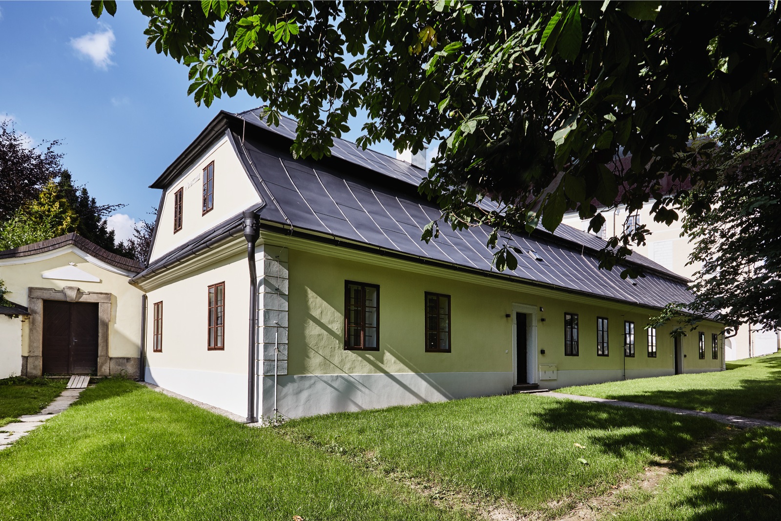 „Se stoupající návštěvností roste i poptávka po ubytování, což byl hlavní důvod přestavět Zahradníkův domek. Donedávna tu bylo informační centrum, původně ale sloužil jako stáj a v roce 1833 zde žil zahradník. Designérce i architektce jsem nechala volnou ruku, věděla jsem, že projekt svěřuji správným lidem,“ říká hraběnka. V Zahradníkově domku se nacházejí čtyři luxusní apartmány. Každý z nich vítá hosty předsíňkou s příjemným posezením, kde ze stropu zhlíží nádherný florální oblak jako obří lustr. Odtud se vstupuje do velkého pokoje s manželskou postelí. Pokoje nabízejí stejný komfort, ale aby bylo možné je odlišit, má každý jiné barevné ladění. Hosté mohou nocovat v růžovém, cihlovém, žlutém, nebo zeleném pokoji. „V místnostech jsme pracovali s barvami Kreidezeit, které jsme probarvovaly přírodními pigmenty a vznikly tak unikátní odstíny. Mým záměrem bylo se co nejvíce přiblížit tomu, jak a čím se malovalo dříve,“ popisuje Alexandra Dýcková. „Nábytek jsem volila moderní, ale nikoli módní. V tom je velký rozdíl. Módní věci vás baví jednu sezonu, než je nahradí nový trend, kdežto moderní design může žít v interiéru věčnost. V každém pokoji je nábytek vyrobený na míru s pár starožitnými kusy, některými přímo z depozitáře zámku. Každý pokoj je odlišený také tvarem čela postele, které vyrobil a namořil pečlivě vybranými odstíny truhlář. V tvarosloví jsme vycházeli z architektury zámku,“ dodává designérka.