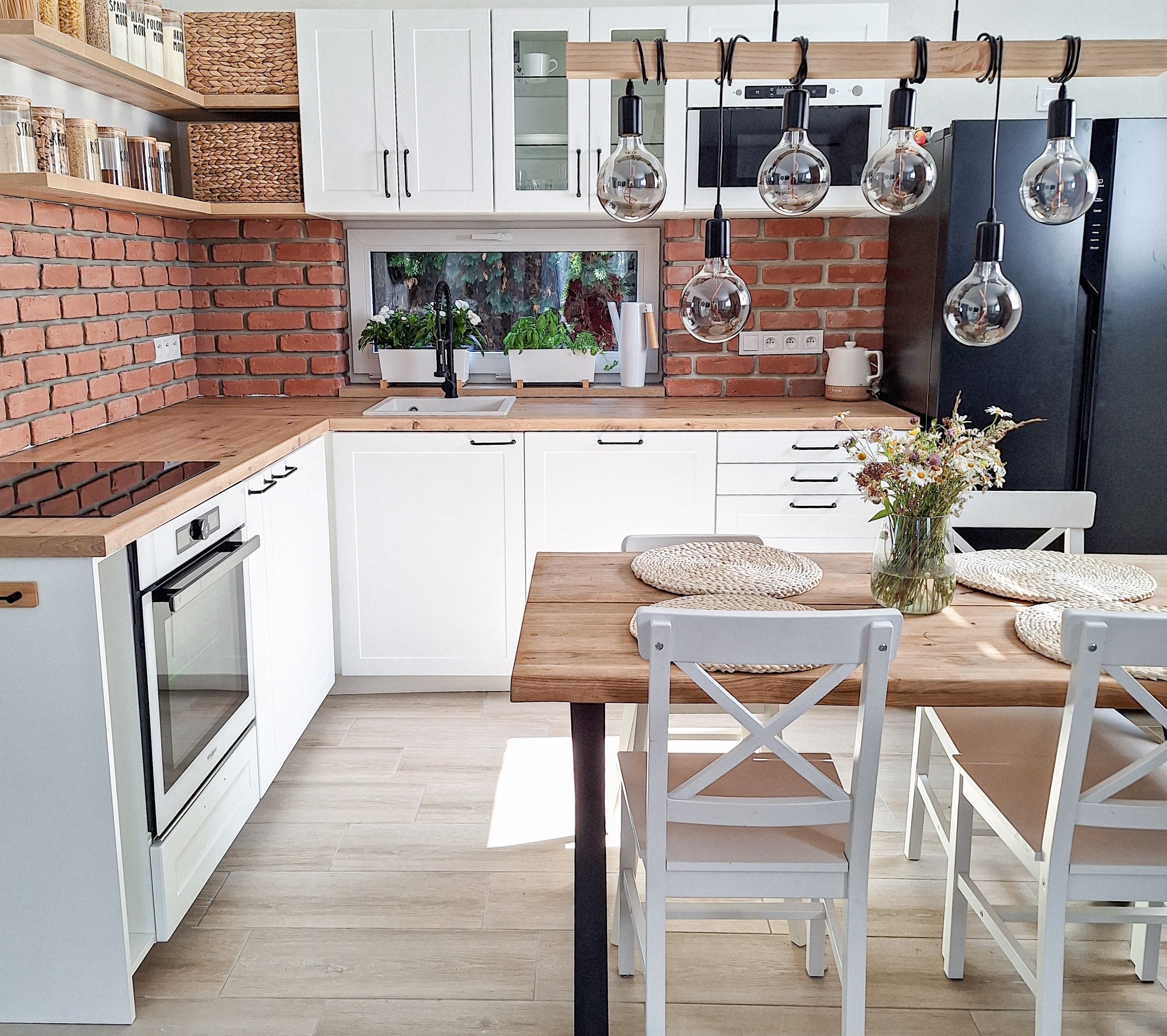 „Dům jsme stavěli hlavně svépomocí – tedy manžel, protože se nám mezitím narodil syn, takže moje role byla spíš v péči o miminko,“ říká majitelka se smíchem. Na ty nejzásadnější práce si sice přizvali odborníky, ale většinu detailů zvládli vlastníma rukama. Orientaci domu a rozložení místností konzultovali s projektantem, co se týká interiéru a celkového vybavení, to je všechno práce majitelů. Manžel pracoval na stavbě každý den po práci i o víkendech. „Bylo to náročné období, ale motivovalo nás vědomí, že budujeme náš společný domov.“ Po devíti měsících byla stavba dokončená a v květnu 2021 se rodina konečně nastěhovala. „Kuchyňskou linku jsem si sama vymyslela a podle rozměru seskládala z Ikea skříněk, kde nám to rozměrově vyšlo v podstatě na centimetry přesně. Skříňky jsme si pak nechali doplnit dlouhými policemi v barvě pracovní desky a nechali ji tím lehce provzdušnit. Mým největším přáním byl v kuchyni cihlový obklad, není to určitě praktické, tak jako kdyby tam byl klasický omyvatelný obklad, ale ani tak bych neměnila, je to má srdcovka a celá místnost má díky tomu úplně jiný šmrnc, takže tady šla praktičnost na úkor estetiky lehce stranou,“ dodává s pýchou majitelka. Na domě je hodně výrazný přesah ke skandinávskému stylu a převládá zde bílá, černá a dřevo. To je oblíbeným materiálem, protože dodává domovu teplo, útulno a je nadčasové. Se dřevem oba rádi pracují. Kristýna dokonce vyrábí dřevěné dekorace na zakázku.