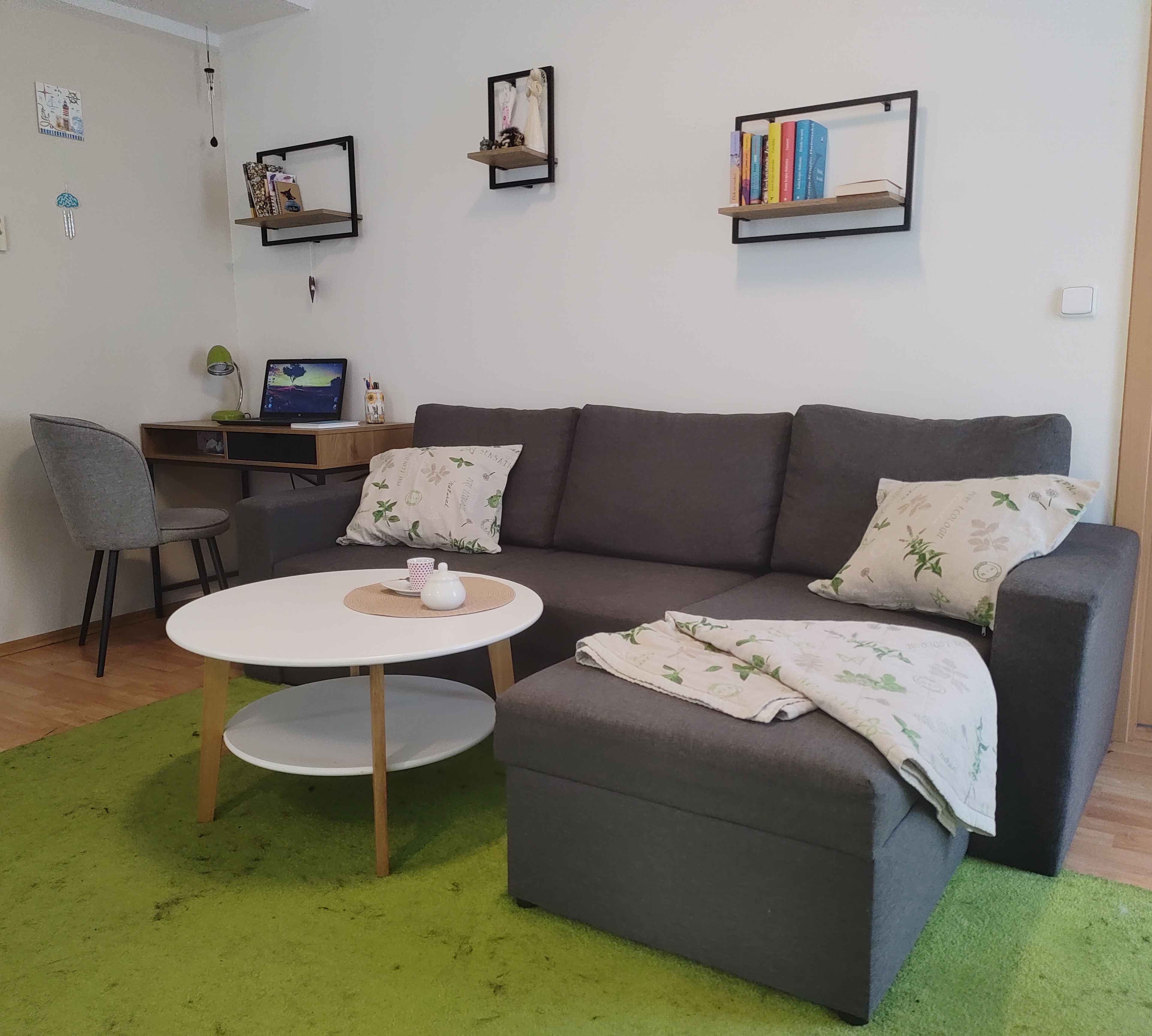 Při vstupu do bytu je hned patrné, že tu někdo přemýšlel nad detailem. Zmizela stará, masivní skříň a místo ní stojí jednoduchý věšák a krásné mozaikové zrcadlo od paní Moniky Taschové. To prostor nejen opticky rozšířilo, ale zároveň mu dodalo jedinečný rukopis. Pejsek Dasty má v předsíni své vyhrazené místo, kde může v klidu odpočívat, což je krásný důkaz toho, že domov je sdíleným místem i pro čtyřnohého člena rodiny. „Mému srdci je blízké učení feng shui. Nejsem na něj žádný odborník, znám základní principy, kterými se řídím. Ne vždy však prostor umožňuje naprosto dokonalé sladění. Jako nejdůležitější zásadu vnímám úklid ve smyslu, aby se nikde neválelo nějaké staré nepotřebné harampádí.“ Největší proměnou prošel obývací pokoj spojený s kuchyní. Simona zrušila dveře, které zbytečně komplikovaly prostor, odstranila těžký nábytek i knihovny. Ty nahradily jednoduché otevřené police z Jysku a staré knihy předala nadšenci, který se o ně rád postará. I když ona sama se považuje za minimalistku, ráda do místností vnáší útulnost pomocí dekorací, záclon, polštářků a živých květin. Důležitým zásahem bylo i odstranění žaluzií. Ty nahradily záclony a hořčicově žluté zatemňovací závěsy, protože propouštějí více světla a zároveň tlumí zvuky a dodávají pokoji hřejivost. „Byt se nachází v přízemí přímo nad garážemi, a tak jsem tu ze začátku docela řešila plíseň na stěnách vedoucích do ulice. Proto jsem nechtěla žádný nábytek, co by měl zadní stěnu, aby zdi mohly dýchat. Po třech letech bydlení, kdy je byt užíván každodenně, není po plísni ani památka.“ Zajímavostí a velkým dekorativním prvkem je obraz na stěně, který si Simona namalovala sama. Jejím hobby jsou různé tvůrčí techniky od malování, přes decoupage až po psaní.
