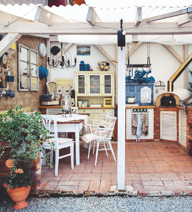 Pozemek za polovinou baťovského dvojdomku v městečku na Vysočině by nejspíš nebyl snem každého novopečeného majitele nemovitosti. Zarostlá, úzká a dlouhá zahrada, jejíž zadní část se navíc příkře svažuje a vysokým porostem se tu prohání párek slepic po původních majitelích. Nemluvě o samotném domku, který zoufale potřeboval rekonstrukci. Rostislav a Zuzana Morkusovi v obojím ale viděli výzvu. Pozemek koupili v roce 2006, následující rok probíhala základní přestavba a další čtyři roky neúnavně a vlastními silami pracovali na zařízení interiéru i dvorku tak, aby vyhovoval teď už čtyřčlenné rodině. Po dalších čtyřech letech přišla konečně na řadu vytoužená venkovní kuchyně. Zuzana, keramička, milovnice anglického venkova a blogerka, si vše do detailu předem promyslela. V místě, kde stávaly podivné dřevěné kůlničky, zůstala podlaha ze starých půdovek. Kolem ní nechala vyhloubit a vybetonovat základy pro cihlové zídky, které dnes tvoří obvod kuchyně a zároveň jsou v nich vestavěné záhony i otevřené ohniště. Shora kuchyni zakryli jednoduchou, na bílo natřenou pergolou.