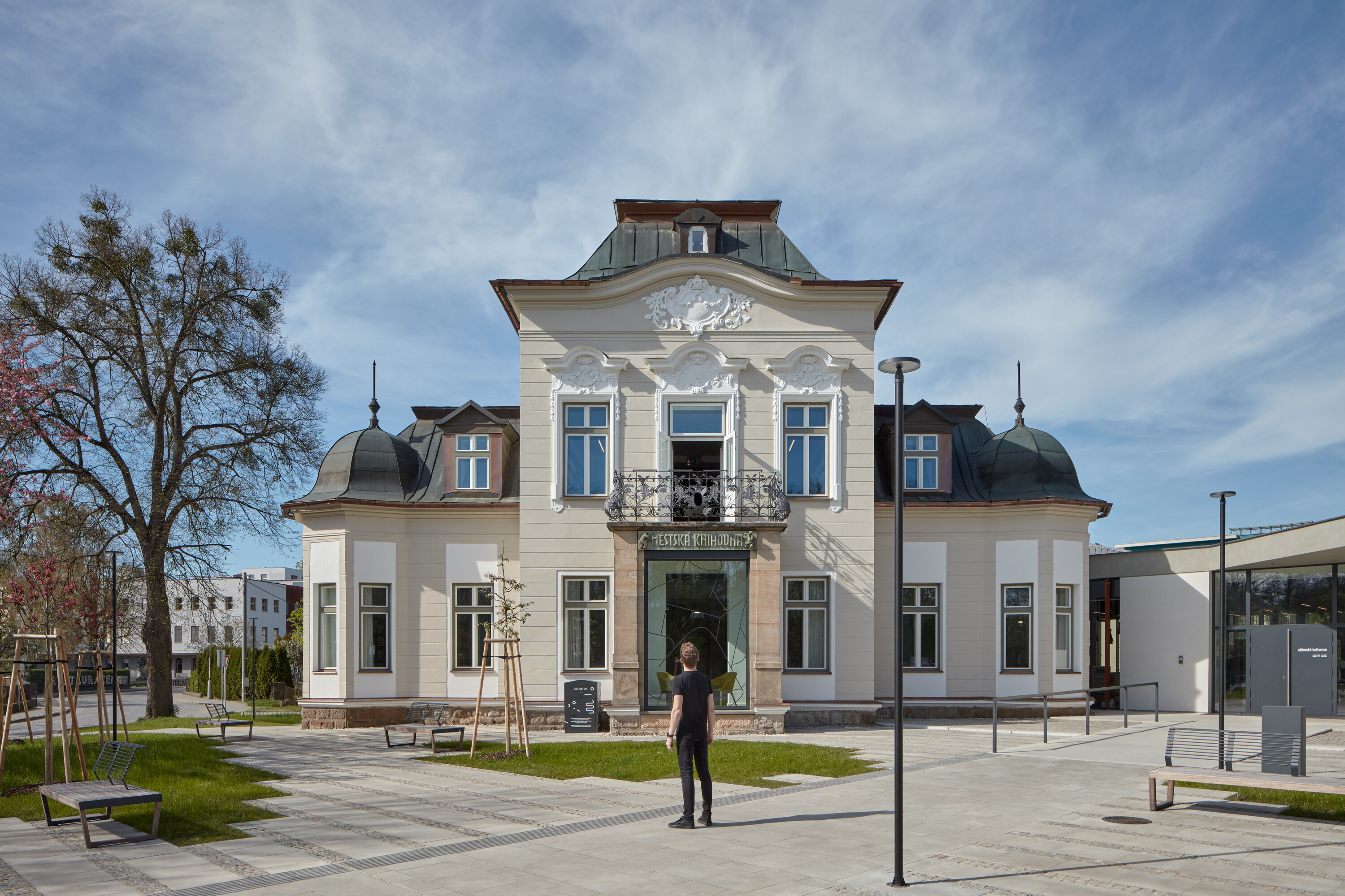 V otevřené architektonické soutěži v roce 2016 vyhrálo architektonické studio ČTYŘSTĚN. „Cílem bylo najít nejvhodnější řešení pro rozšíření kapacity městské knihovny, protože její prostory v historizující vile nestačily pro výukové programy a další aktivity, které k moderní knihovně patří,“ architekt Karel Kubza. Přístavba vytváří předěl mezi úplně novým veřejným prostorem na nároží ulic a zahradou a funguje jako nový vstup do knihovny. Role přístavby a vily se tím otáčejí. Přístavba je novým hlavním prostorem, který splňuje požadavky na moderní knihovnu s kavárnou a přednáškovými prostory. Vila teď funguje především pro dospělé čtenáře - jako čítárna, studovna a zázemí pro administrativu knihovny. Přístavba a stará vila mají proto výrazně odlišný charakter interiéru. Nová budova je moderní a vzdušná, otevřená do zahrady svou skleněnou fasádou. Je věnovaná novinkám, dětským knihám, kavárně, přednáškám a workshopům. Vysoké dřevěné regály jsou zakomponované do stěn, police v prostoru jsou nízké a pojízdné, aby byl interiér přehledný a uměl se přizpůsobovat aktuálním potřebám. Podél prosklené fasády jsou čtecí místa s křesly pro dospělé, děti se schovávají s knihami do zákoutí v policích a batolata lezou v ohrazeném „pískovišti“. Díky různým výškám polic, stolů i sedacích prvků si každá věková skupina najde svoje místo.