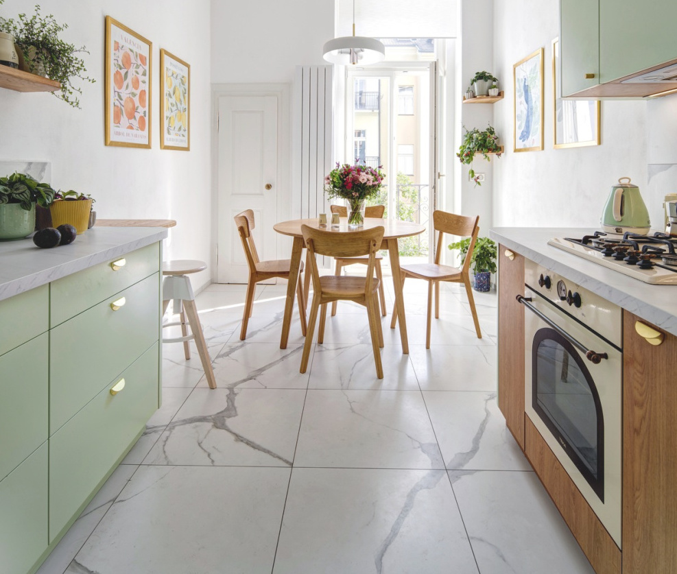 Návrh rekonstrukce svěřila Ana-Maria architektce Michale Navrátilové, stavební úpravy pak firmě M & B Construct. Zásadní byla kompletní výměna podlah, oprava stěn a obložení koupelny. Hlavní myšlenkou bylo zachovat atmosféru z počátku 20. století, která celým bytem stále rezonuje. „Během prací jsme dávali pozor na každý detail, nechtěli jsme nic poničit. Opravili jsme i původní dvoukřídlé dveře včetně výplní z pískovaného skla, poškozené jsme nechali vyrobit znovu. Repasovaly se i staré dveřní a okenní kliky, jejichž zlatobronzový odstín se v interiéru opakuje na svítidlech, koupelnových bateriích i odlescích tapety. Miluju design a navrhovat interiéry mě moc baví, i když mě to neživí a je to spíš koníček. V našem bytě jsem se soustředila hlavně na práci s prostorem, barvami a světlem, což je přímo jako kapitola z učebnice designu,“ usmívá se Ana-Maria. K bílé barvě na stěnách ladila nábytek a vintage doplňky v tmavě růžové, lososové a lesní zelené. Právě mechově zelená do interiéru obtiskává odstíny listů z korun stromů v parku, které jsou na dohled z okna. Teplá béžová a prosluněná zlatá se decentně objevují především na tapetách s drobným vzorem. Jde o nadčasovou kombinaci v jemném retro stylu navracející atmosféru dob pozdní secese. I při výběru materiálů se Ana-Maria držela dobové linky, plastu se vyhýbala, u truhlářských prací vsadila na kvalitní kousky z masivu. „Chtěla jsem tu mít jen přírodní materiály, které jsou udržitelné a mají dlouhou životnost, proto jsem volila dub, jak pro jeho světlý odstín, tak i sílu a pevnost. Výsledek se nám všem moc líbí!“