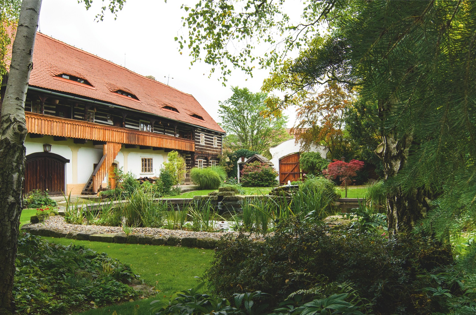 Lepší pozemek si dvojice vybrat nemohla. Na jednom jeho konci se v dáli rýsuje Milešovka a Říp, na druhém stojí roubenka ze 17. století. Kdybyste ji tehdy viděli ve zbědovaném stavu, nejspíš byste si zaťukali na čelo a pronesli cosi o bláznovství toho, kdo by se ji snažil zachránit. Jenže to neznáte Lenku s Tomášem, jimž práce není citzí, a to všeho druhu. Po pár letech dozorovaných památkáři, vyvedli cennou ukázku lidové architektury z propadliště dějin a začali v ní komfortně bydlet. Krom všeho ostatního prošla puntičkářkou renovací také pavlač dlouhá asi dvacet kroků. Vchází se na ni dveřmi z útulných pokojíků nebo po schodech vedoucích ze zápraží. Ještě se nenašel nikdo, kdo by odolal jejím výšinám. Vidět je z ní na náves a zahrada ve dvoře uzavřeném impozantní bránou s klenutým nadpražím se odtud prostírá jako na dlani. Zatímco dole, když stojíte s nohama zabořenýma v měkké trávě, se vám svou mohutností vnucují břízy a lípami a jehličnany, při pohledu z ptačí perspektivy dominuje nad vším ostatním blyštivá hladina koupacího jezírka, tvarem připomínající nakousnutý proslulý valašský koláč frgál, o které se rodina dělí s lekníny, rybami a jinými vodomily.