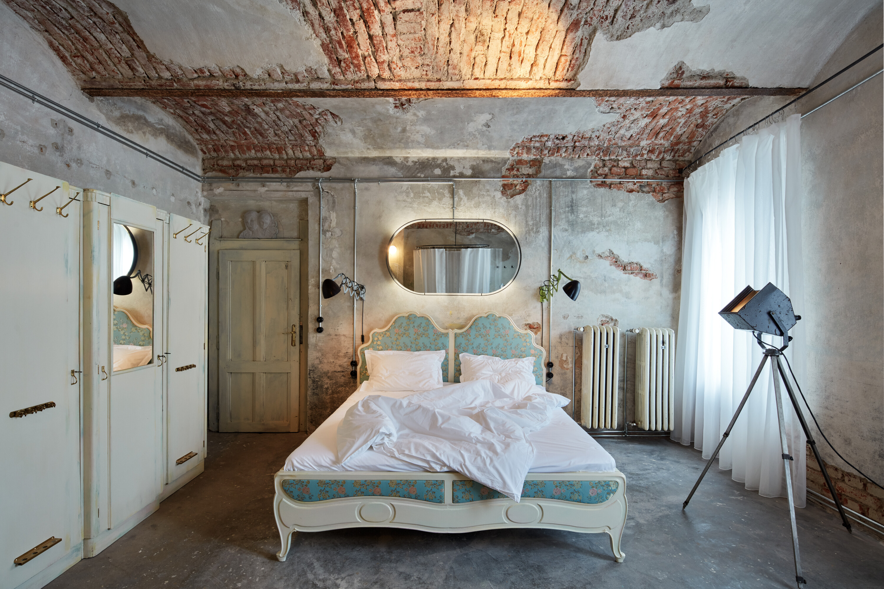 Postel je nakonec největším objektem, který dělí prostor na několik pocitových místností. Užitná plocha ateliéru je 31 m² a celkové náklady na rekonstrukci byly 760 000 Kč. V interiéru najdeme porcelánové zásuvky a vypínače značky THPG, koupelna je vybavena retro výrobky značky Sapho, starý nábytek byl pořízen v antiku Spomyšl. Na třiceti jedna metrech čtverečních tu najdete obstojné bydlení včetně šatny, kuchyně, koupelny, pracovny i ložnice. Rozvody jsou přiznané v trubkách, je to přece prádelna. „Nábytek, který se ukrýval na vedlejší půdě, bylo potřeba trochu oživit a upravit. Skříň jsme museli přeříznout v půli, aby prošla dveřmi, do stolku zabudovat elektrický vařič, z prádelních kamen v rohu udělat dřez nebo ze dvou postelí udělat jednu nově polstrovanou jemným brokátem. Do tvrdého prostoru tak vstoupila měkkost a pohodlí. Vše, čeho se každodenně dotýkáme je nové, pozadí ale tvoří původní stav věcí. Téma očisty zůstává stále středobodem tohoto interiéru, vana stojí v prostoru na čestném místě přímo proti vstupním dveřím. Při koupeli je tak možné pozorovat nebe, a v zimě bílé květy, které na okno kreslí mráz,“ uzavírají spokojení architekti.