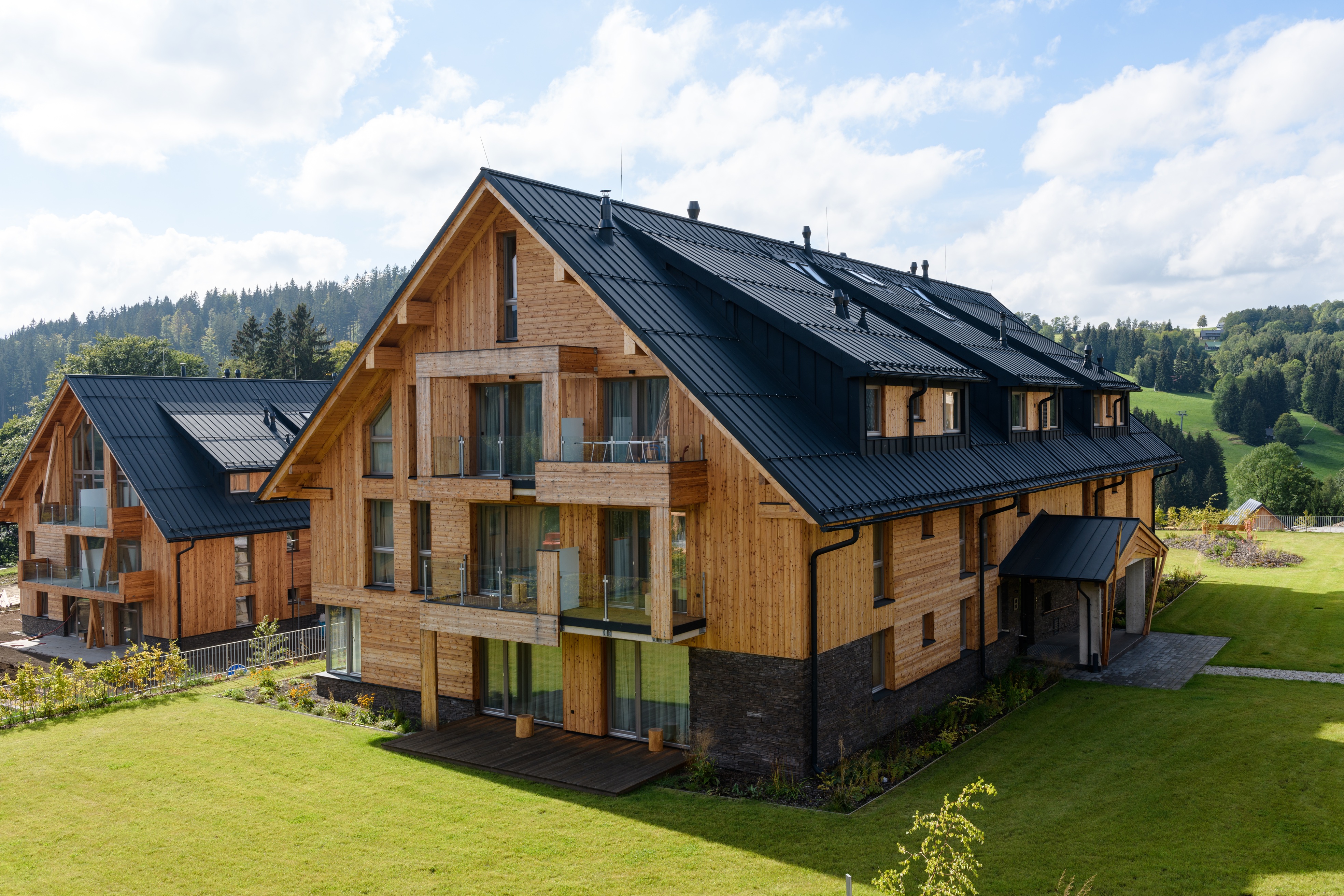 Zvenku areál zapadá do krajiny bez velkých gest. Dřevo, šikmé střechy, jednoduché tvary. Uvnitř ale najdete promyšlený prostor, který stojí na materiálech a světle. Dřevo tu hraje hlavní roli, doplňuje ho kámen, sklo nebo beton. Všechno drží pohromadě bez zbytečných kontrastů. Interiér nepůsobí jako designový experiment a ani to nebylo jeho cílem. Tady se především dobře bydlí. Velká okna propojují interiér s okolím tak, že hory nejsou jen za sklem. Stávají se součástí prostoru. Během dne se mění světlo i atmosféra, takže byt nikdy nepůsobí stejně. Hlavní je obytná část, kde můžete vařit, pracovat i odpočívat na jednom místě. Dominantou je velký stůl, kolem kterého se všechno odehrává. Ráno snídaně, přes den práce, večer víno s přáteli. Ložnice naopak drží klidnější tón. Důraz autoři kladli na tlumenější barvy a pohodlí. Nic tu neruší, nic nepřebývá. Celý interiér nechává prostor i pro vlastní styl. Někdo zůstane u čistého základu, jiný přidá obrazy, textilie nebo osobní věci. Díky tomu nevypadají apartmány strojeně. Každý si může vytvořit svůj individuální prostor. „Chtěli jsme vytvořit místo, které bude působit autenticky. Aby člověk cítil, že je na horách, ale zároveň měl všechen komfort, na který je zvyklý,“ říká Radek Zábrodský ze společnosti CRESCON.