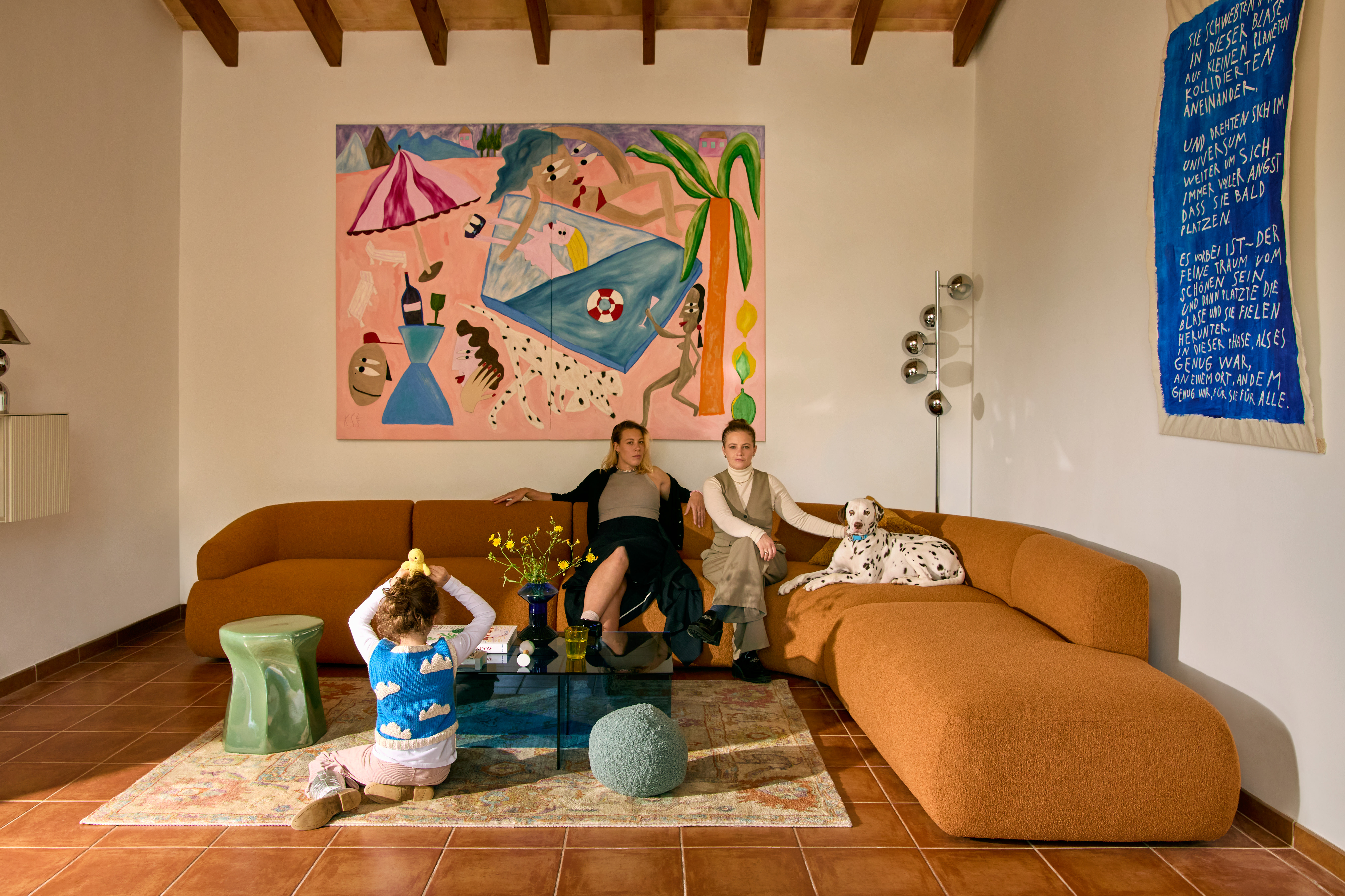 Dvojice se rozhodla, že jejich domov nebude jen místem k bydlení, ale také k tvorbě. Právě proto v komunitním domě vítají umělce, kteří zde mohou pracovat a nacházet inspiraci. Významným hostem pro ně byla i berlínská malířka Kristina Supernova, známá svými surrealistickými portréty s pozměněnými proporcemi. Oblíbeným prvkem její tvorby jsou dva páry očí. Pro pár vytvořila umělecké dílo visící nad rohovou pohovkou v komunitním domě. Zobrazuje letní atmosféru u bazénu a nějaké postavy. Z nábytku výrazně vyčnívá okrová sedačka z Westwing, stejně jako chromová lampa v rohu, modrý skleněný stolek s květinami i koberec v rustikálním stylu na zemi. Jídelna skrývá kuchyňský kout s původními zdmi a dřevěný stůl se šesti židlemi. Doplňky jsou zde spíše upozaděné. Stačí jen pár obrázku na stěně a svícny na stole, aby atmosféra zůstala zachována. Přestěhování na Mallorcu přineslo celé rodině nový rytmus života. I když stále tráví hodně času v Berlíně, rádi se vrací sem, na místo, kde čas plyne pomaleji a každá chvíle má svůj význam. To ostatně potvrzuje i Jasna: „Toto místo nám, samozřejmě, poskytuje nejen klid obklopený širokou přírodou, ale také nesmírnou inspiraci. Je to výrazný kontrast k životu v Berlíně, našemu životu v Berlíně. I když si myslím, že ten můj je stále více zasazený do městského prostředí než ten tvůj. Ale vždy, když se sem vrátím, si vážím možnosti nechat za sebou pulzující metropoli. Miluji městský život, ale díky tomu, že tady žijeme, si mnohem víc vážím krásy přírody. Teď cítím hlubší spojení s přírodou. Ráda chodím na dlouhé procházky, túry, nebo se jen tak toulám po pobřeží a naplno si užívám ten čas, který tu máme.“ Katharina s tím naprosto souhlasí: „Ano, člověk tady zpomalí. Stane se tišším. Všechno se tady usadí do jemnějšího rytmu. Život se odkrývá pomalejším tempem.“ Jejich malý ráj je pro ně prostorem k růstu, k inspiraci, a především k životu, který si vždy přály. Nejde jen o krásný dům. Toto je místo, kde mohou být samy sebou. A přesně takto vnímají i heslo „Live Beautiful“. „Nezáleží na tom, jak turbulentní mohou být naše životy, ani na tom, jak hlasitý bude svět kolem nás, jediné, na čem skutečně záleží, jsme my.“