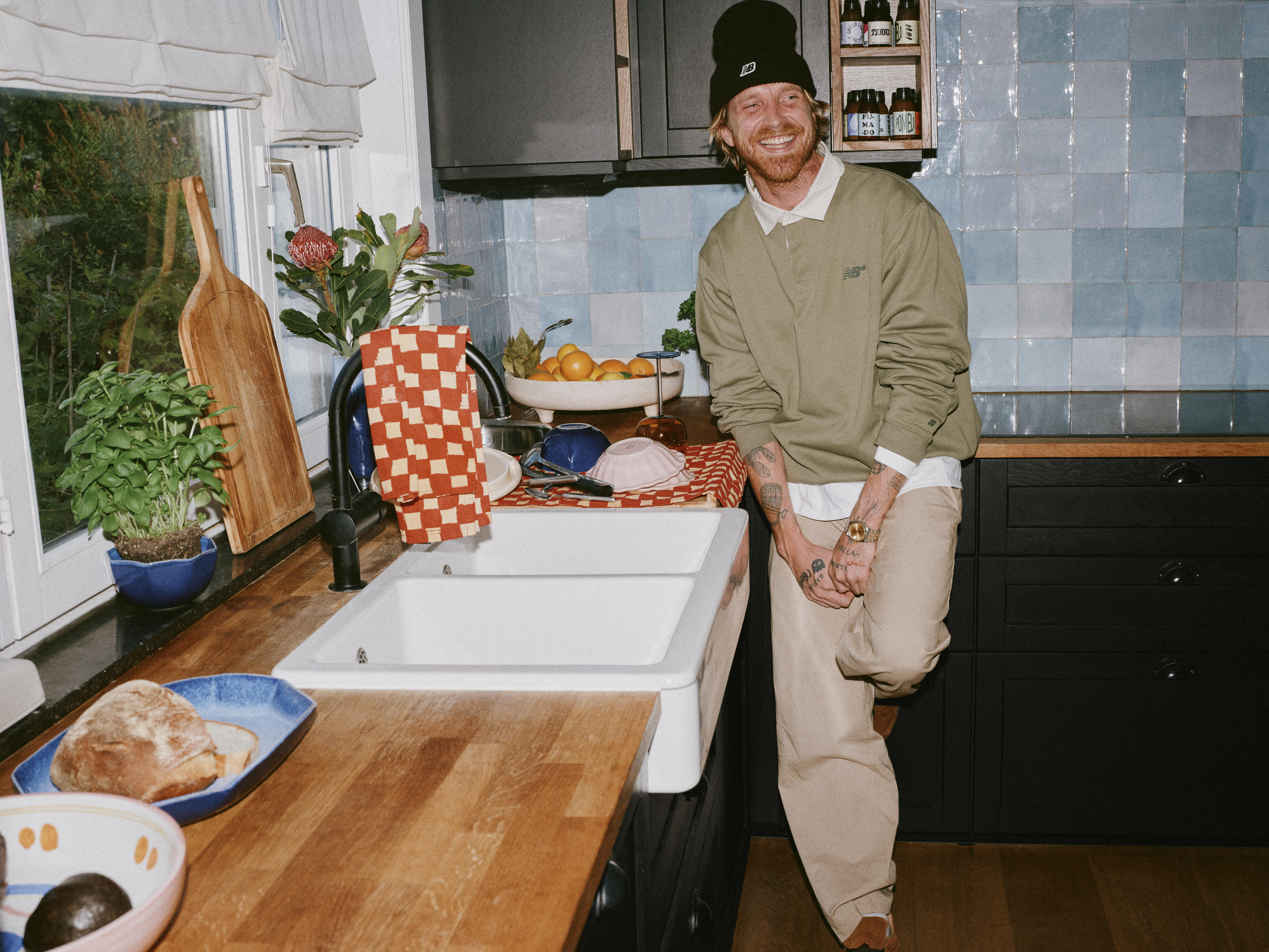 Obývák je srdcem celého domu. Místo, kde se odpočívá, tvoří i hraje. „S Roméem si nejraději hrajeme v obýváku. Je to náš hlavní prostor, tady rád odpočívám, čtu si knihy. Jsou zde mé obrazy a také tyto skejtbordy, které jsou výsledkem spolupráce s La skaterie. Jsou velmi barevné a myslím, že se sem pěkně hodí, zejména k polštářům na gauči,“ popisuje Paul. Dominantou prostoru je zelená manšestrová sedačka, kterou oživují barevné polštáře. V detailech se tu opakuje oranžová. Vidíte ji na dece, lampě i dětské židličce. Celek působí hravě, ale zároveň promyšleně. Stěnu zdobí umění i osobní objekty, včetně tří skateboardových desek. Vytvářejí spolu na stěně plátno pro modro-bílý obraz. Hned vedle můžete vidět další umění, odkaz na hip-hopové a jazzové nahrávky Jazzmatazz od amerického rappera Guru z devadesátých let. „Mám rád věci, které mají příběh. Každý kousek tady něco znamená,“ usmívá se Paul.