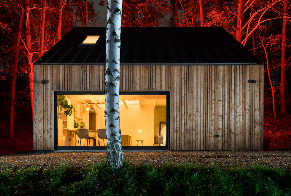 Hytta leží na jižním svahu na okraji borového lesa, který chatu dělí od okolní civilizace a poskytuje dostatek soukromí a klidu. Půdorysně navazuje na bývalou mysliveckou chatu, jejíž tvarové pojetí z velké části respektuje. V přízemí se nachází obytný prostor s kuchyní, předsíň, koupelna, technická místnost a venkovní koupelna přístupná zvenku. Hlavní obytná zóna je otevřena do štítu, aby poskytovala velkorysý prostor pro přemýšlení. Z obytné zóny je přístupná koupelna, která díky černé stěrce a nábytku upoutá svou intimní atmosférou. Součástí kuchyně je schodiště ze subtilního plechu zavěšeného na táhlech, které svou lehkostí volně stoupá do podkroví. V podkroví se nachází hlavní ložnice orientovaná na východ. Velkým oknem vstupuje do ložnice ranní sluníčko a dává vám možnost sledovat probouzející se přírodu rovnou z postele. Z ložnice je přístupná také jedna ze dvou útulen. Druhá útulna využívá loftu hlavního obytného prostoru a je přístupná po žebříku. Díky dvěma útulnám, se v Hyttě pohodlně vyspí až šest osob. Velký dubový jídelní stůl v obytném prostoru plní zároveň i funkci pracovního stolu. Technické zázemí pro práci se dá pohodlně vysunout nad stůl z jedné ze skříněk knihovny. Kvalitu pracovního prostředí zlepšuje také internet od Starlinku a biodynamické osvětlení, které po setmění neobsahuje modré záření a lépe se vám tak usíná. Chata je vytápěná primárně litinovými kamny na dřevo. Sekundární temperování je zajištěno podlahovým topením. Jen pár metrů od Hytty najdete moderní finskou saunu s otužovací kádí. Objekt je umístěn v mírně svažitém terénu, díky čemuž nabízí při saunování nerušené výhledy do přírody. Stavba má rozměry 6 x 3,5 m a skládá se z odpočinkové zóny, sprchy a samotné finské sauny. Stejně jako samotná Hytta se nese v duchu skandinávského minimalismu a díky fasádě z opalovaného dřeva téměř splývá s okolní přírodou. Stavba je založena na zemních vrutech a do objektu se vstupuje přes ocelovou rampu, což dodává stavbě příjemnou lehkost.