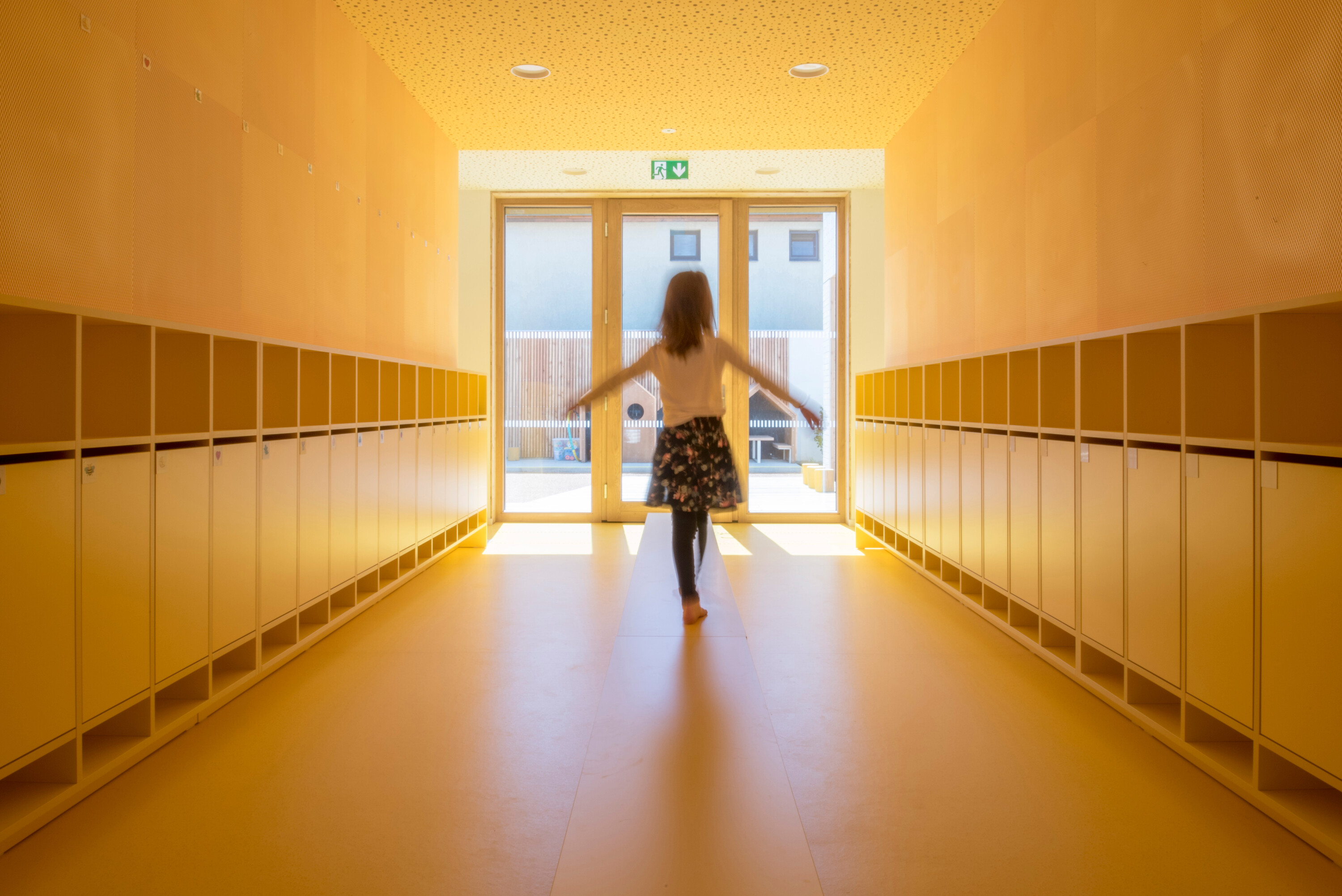 Interiér školky je řešený s důrazem na barevnost, akustiku i praktičnost. Třídy jsou rozdělené na jídelní a herní část pomocí barevných ploch, které zároveň podporují orientaci dětí. Atypický nábytek podél stěn šetří prostor, slouží k uložení potřebného vybavení a zároveň nabízí herní prvky. Okna mají posedové parapety, aby byl výhled dostupný i nejmenším dětem. V patře našlo místo zázemí pro personál a kancelář ředitelky, přičemž subtilní zábradlí na střešní terase téměř neruší celkový dojem. Zahrada, i když není velká, je hravě členěná – nabízí pískoviště, herní prvky z akátového dřeva, malé pódium i okrasnou třešeň, která časem poskytne stín. Celý projekt působí funkčně a zároveň hravě, je přirozeně začleněný mezi rodinné domy a vytváří prostředí, které dětem poskytuje nejen kvalitní zázemí, ale i podnětný prostor pro každodenní objevování.