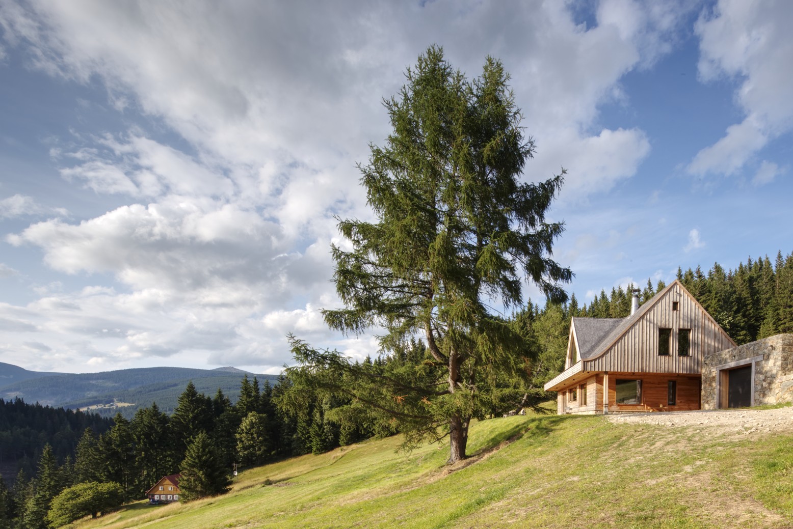 Projekt nové chalupy, navržený studiem A1Architects pod vedením Lenky Křemenové, Davida Maštálky a Zuzany Sagitariové, představuje mistrovskou ukázku spojení současné architektury s respektem k tradičním hodnotám a přírodě. Zadáním bylo nahradit původní německou chalupu stavbou, která by harmonicky navázala na kulturní a historický kontext místa, a přitom přinesla moderní komfort a trvalou udržitelnost pro další generace. Majitel chalupy, Pavel, měl jasnou vizi – obnovit místo tradiční chalupy novým domem, který by odrážel respekt k přírodě a tradici, ale zároveň splňoval potřeby současného životního stylu. Pavel se inspiroval starým indiánským příslovím: „Zemi nedědíme od našich předků, ale půjčujeme si ji od našich dětí." Tato filozofie se promítla do celého projektu, kdy hlavním cílem bylo vytvořit dům, který bude dlouhodobě sloužit a zároveň minimálně zatěžovat životní prostředí. Architektonické řešení chalupy se opírá o snahu zachovat „kus Země pro další generace“. To se projevuje v použití tradičních řemeslných postupů a materiálů, v kombinaci s moderními technologiemi, které zajišťují energetickou efektivnost a pohodlí. Dům je vybaven tak, aby splňoval současné standardy, ale zároveň si uchoval ducha chalupy, která žije v souladu s okolní přírodou.