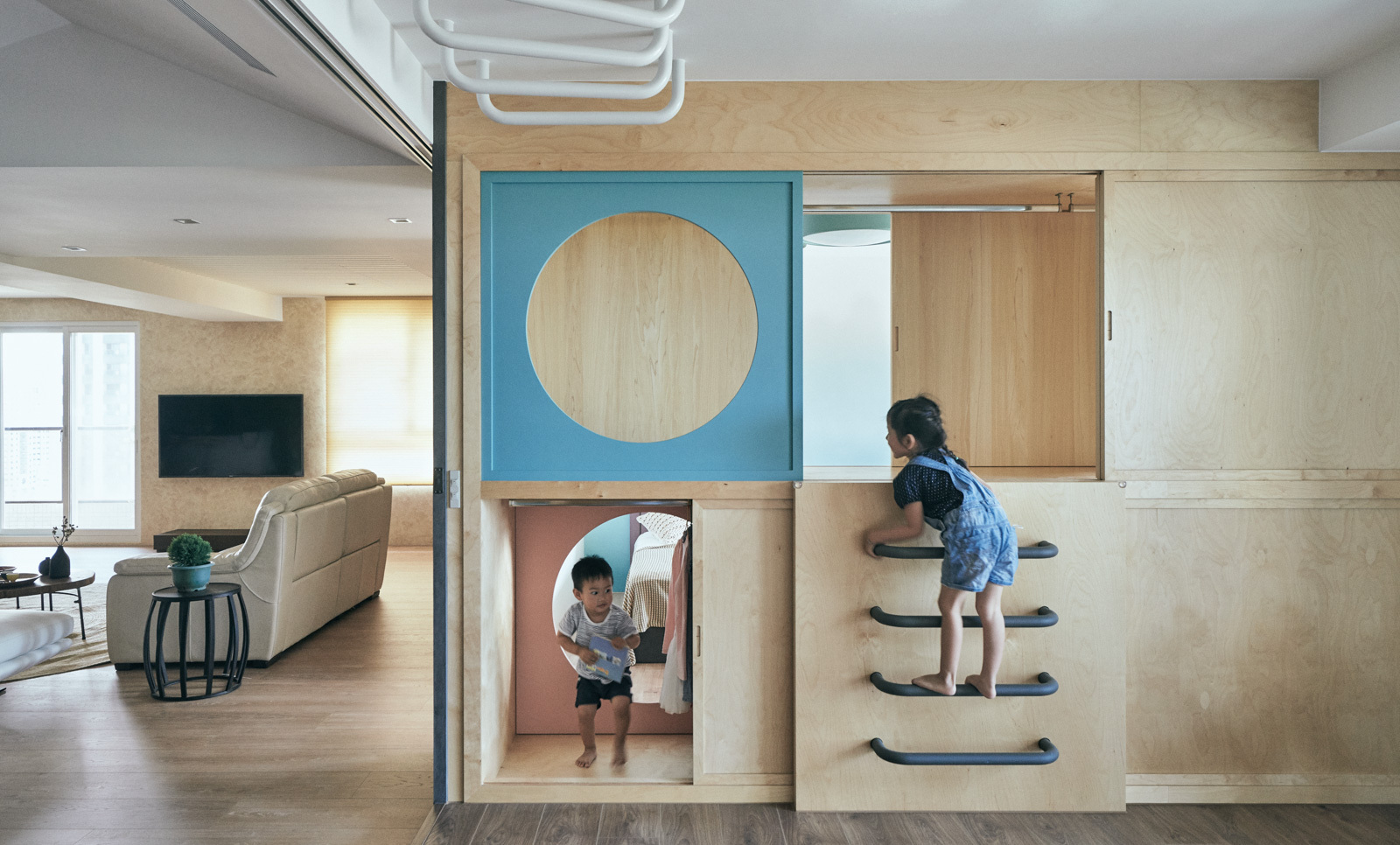 Byt se nachází v tchajwanském městě Gaoxiong, v jedné z jeho moderních čtvrtí, kde nechybí park, obchody i umělecké galerie. Manželé, kteří jsou oba lékaři, hledali ideální bydlení pro sebe a jejich dvě malé dcery. Zatímco pro hlavu rodiny je důležité bydlení v duchu zenu, jeho žena si oblíbila jednoduchý severský styl. Starší z dcer je velmi společenská a akční, zatímco mladší je spíš klidná a tichá. Takhle dostali rozdané karty autoři projektu ze studia HAO Design a jejich úkolem bylo na ploše 183 m² vykouzlit interiér, který dokonale splní vše výše zmíněné a k tomu vznikne přímo v bytě hřiště pro děti. Výhodou bytu je, že netrpí nedostatkem světla, naopak má okna situovaná do všech světových stran. Původní uspořádání ale bylo příliš roztříštěné. „Po dlouhých úvahách, jak jsou rodinnou jednotlivé místnosti využívané, jsme se rozhodli změnit dispozice bytu na 2+1. Hlavní multifunkční prostor je možné ještě rozdělit posuvnou stěnou a vytvořit další soukromou místnost, která může příležitostně sloužit třeba jako pokoj pro hosty. Třetí koupelnu jsme přeměnili na šatnu, abychom maximalizovali úložný prostor,“ popisují HAO Design.