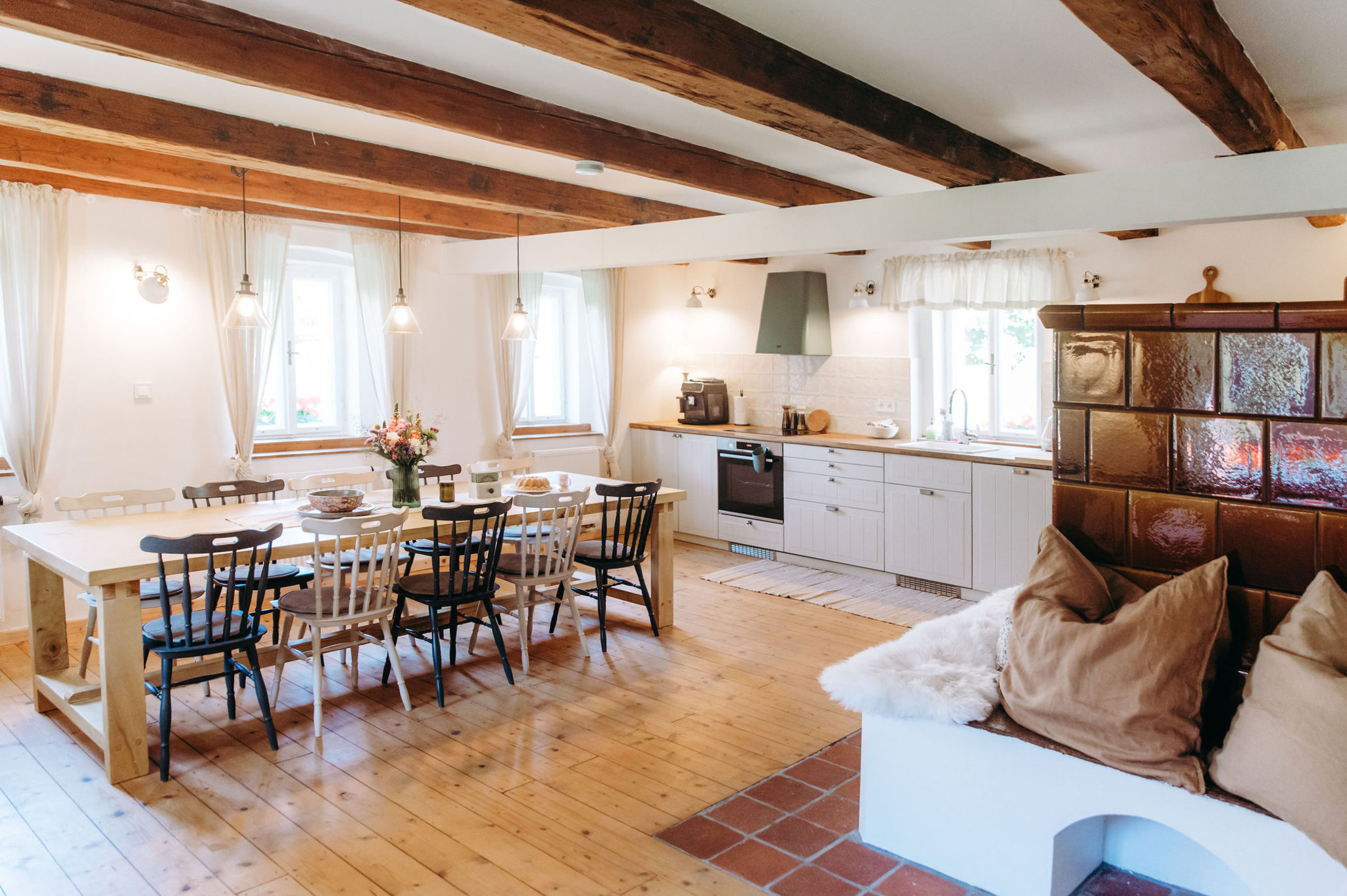 Při vstupu do domu vás přivítá vzdušný prostor plný světla, dřeva a přírodních materiálů. V přízemí se nachází prostorná místnost s kachlovými kamny, plně vybavená kuchyně a dětský koutek, přičemž všude dominuje jednoduchost a funkčnost. Dřevěné podlahy i ručně opracované trámy dodávají prostoru hřejivost. Hrázdění je přiznané ve všech třech podkrovních ložnicích a je typické pro staré chebské stavby. „Typická pro Egerland jsou dřevěná stavební s hrázděnou konstrukcí, často zdobená barevnými prvky. Tato stavení se vyznačují uzavřenými dvory a bohatě zdobenými štíty. Štít ještě nedávno zdobil i náš dům, dnes si ho už ale bohužel můžeme jen představovat.“ V ložnicích čekají na své návštěvníky kvalitní dřevné postele pro dokonalý spánek a tlumené barvy a přírodní textilie umocňují pocit pohody. Teplo do domu vede automatické centrální vytápění. V zimě je tu krásně teploučko, zatímco v létě si dům, díky své konstrukci, udržuje příjemné klima. Nedílnou součástí je samozřejmě zahrada, protože venkovský život by nemohl existovat bez pobytu venku. Prostorný dvůr láká k posezení za dlouhých letních večerů a zároveň nabízí dostatek soukromí. Ať už si vychutnáte snídani pod širým nebem nebo se uvelebíte s knihou v ruce, vždy vás obklopí klid a harmonie.