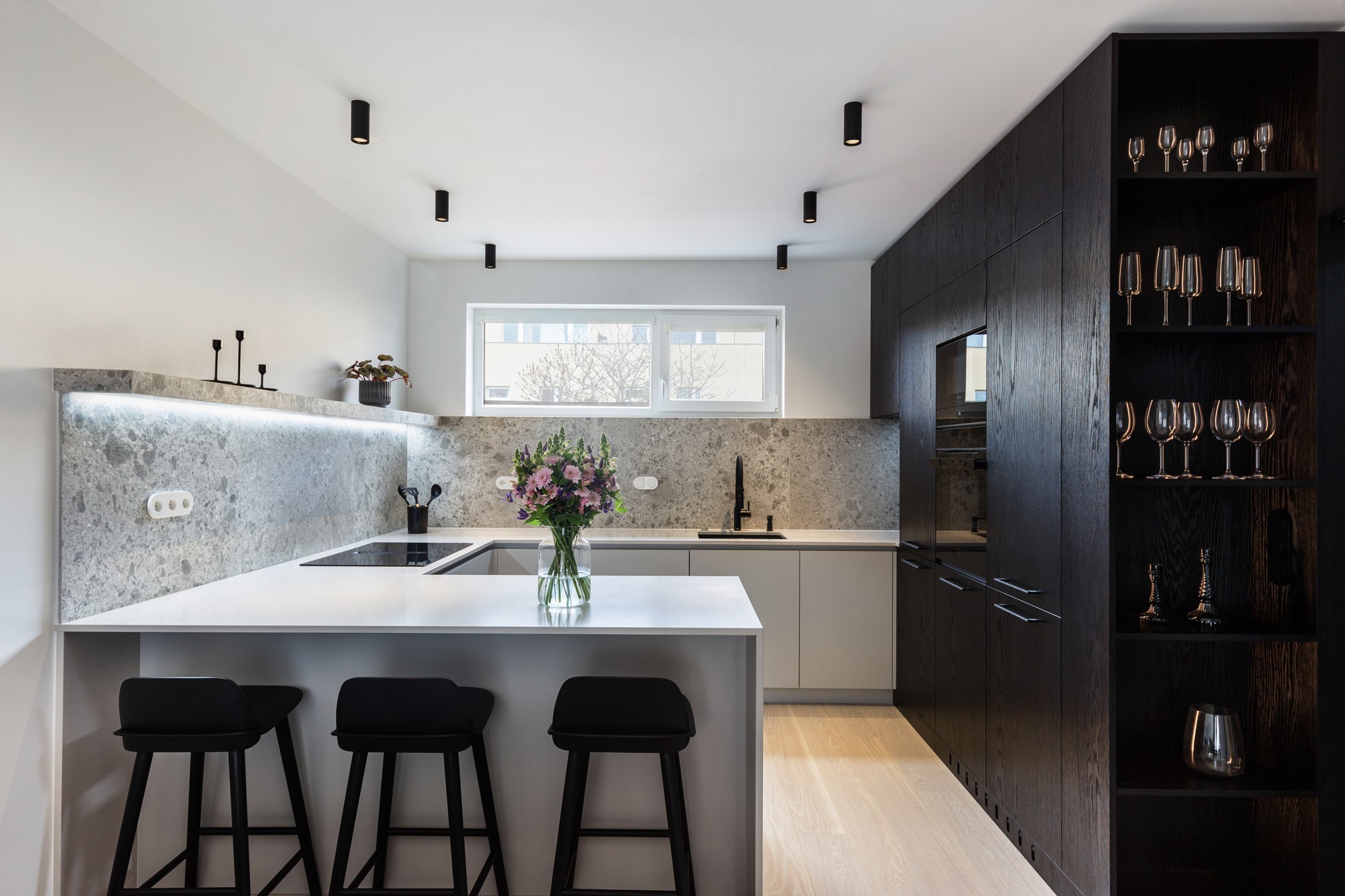 Rekonstrukce třípodlažního rodinného domu v Jenštejně, kterou navrhlo studio BekArch, v sobě spojuje moderní design a praktická řešení pro rodinný život. Spodní část domu zůstala vyhrazena společným prostorám – obývacímu pokoji, jídelně a kuchyni. Architekti provedli jen drobné úpravy dispozice, aby vytvořili částečně oddělenou jídelnu s přímým vstupem na terasu. „Pomocí truhlářského prvku, který slouží jako televizní stěna i pouzdro pro posuvné dveře, jsme dosáhli větší propojenosti prostoru s exteriérem,“ vysvětluje architekt Jan Bek ze studia BekArch. Dominantou interiéru je výrazné černé ocelové schodiště, které se vine celým domem a stalo se nejen funkčním prvkem, ale i estetickým středobodem návrhu.