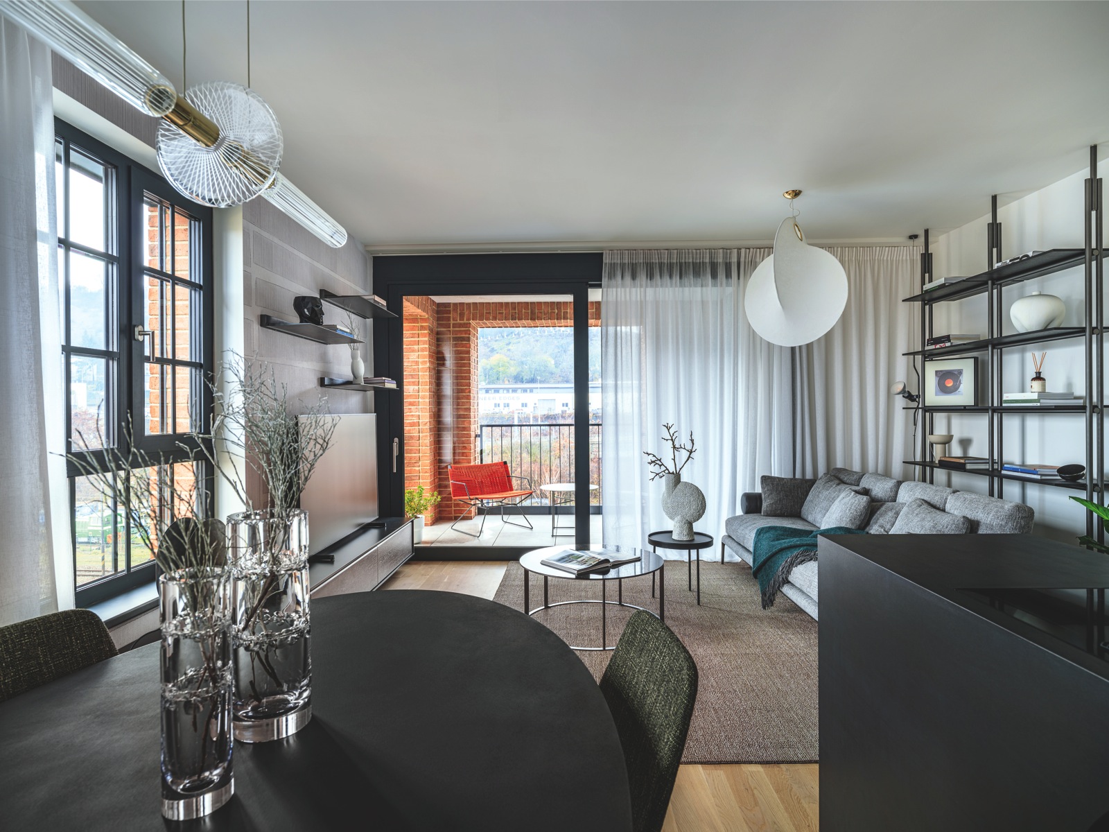 Při vybavování bytů nejde jen o krásu nebo design, ale i materiály a jejich funkčnost a údržbu. Například pracovní desky v kuchyni s ostrůvkem jsou z materiálu SapienStone, což je takový haute couture mezi nábytkovými deskami. Vyrábí se z keramických jílů a minerálních barviv a je odolný vůči tepelné, chemické i mechanické zátěži. Na podlaze všech bytů je standardně třívrstvá dřevěná lepená podlaha, stylově industriální okna s kovovými rámy mají vzhledem k hluku v okolí vysoce účinnou zvukovou izolaci. Celá domácnost je napojena na jeden chytrý systém Loxone, který můžete řídit ze svého mobilu nebo pomocí ovládacího panelu za vstupními dveřmi. Klidný spánek ale nic nenahradí: ložnice má kromě velkého okna i vlastní vstup na terasu. Lehkost, s jakou architekti pojali vybavení, demonstrují roztomilé soudkové noční stolky, stropní svítidlo Flos Taraxacum 88 i malé ambientní lampičky. „Jsme rádi, že jsme se nemuseli nechat tolik svazovat snahou využít prostor do posledního milimetru. Chtěli jsme spíše zaujmout a ukázat možnou cestu,“ uzavírá naši prohlídku architekt Tomáš Hnaníček.