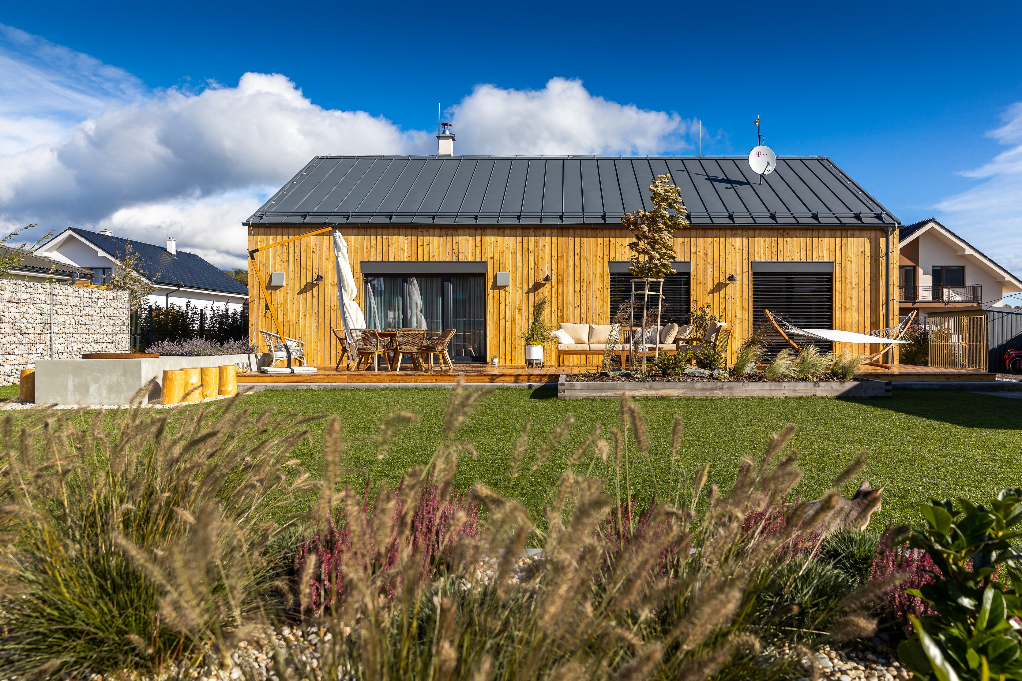 Dům stojí ve vesnici nedaleko Popradu a pyšní se nádherným výhledem na Tatry. Manželé se rozhodli pro typový projekt Vela 115 od firmy Atrium, který si upravili podle svých potřeb. Oba mají ke krásnu hodně blízko. Věnují se zahradám a interiérům. Do této krásné dřevostavby se zamilovali na první pohled. „Hned jsme věděli, že je to přesně ten dům, který jsme si vysnili. Byl jednoduchý, decentní a měl ducha,“ vysvětluje Juraj. „Bylo to spíše impulzivní rozhodnutí“, přiznává. „Když jsme viděli fotky jednoduchého domu s dřevěným obkladem a černou střechou, hned jsme si řekli, že ho chceme. Byl totiž přesně takový, jaký jsme si vysnili – byl decentní a měl ducha. A když firma zareagovala rychle, bylo rozhodnuto. Ani jsme si nedali udělat cenové kalkulace u jiných dodavatelů. Tento dům byl jednoduše ten pravý a hotovo.“
