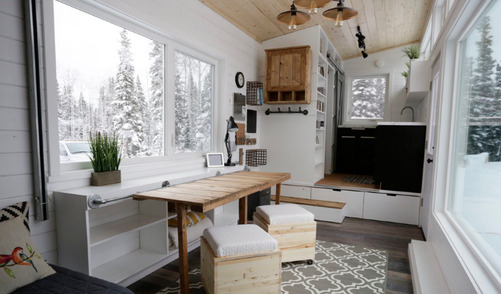Jestli se bojíte, že mini domek nemůže poskytnout dostatečný komfort, tento projekt Any White vás přesvědčí o opaku. Promyšlené detaily a zabudované úložné prostory ponechali v domku dostatek úložného prostoru. V pravé části najdeme kuchyňku a koupelnu. Stojí na dřevěném podstavci, pod kterým je dostatečné místo na sezónní oblečení i sportovní vybavení. Středová část s velikými okny po obou stranách slouží jako šatna, pracovna i jídelna. Záleží, zda se rozhodnete vyklopit stůl a přistavět židle. Vlevo je obývací část s rozkládací pohovkou, na které se vyspí i dva hosté, televizí a odkládacími stolky. Dvoulůžko je zavěšené na pevných ocelových lanech a podle potřeby můžete postel spustit až na úroveň pohovky, nebo spát na zavěšeném lůžku. Konstrukce je natolik pevná, že se postel v jakékoli poloze ani nehne. Tento mini domek dokazuje, že zásadní je promyšlenost interiéru, která nahradí i chybějící metry.