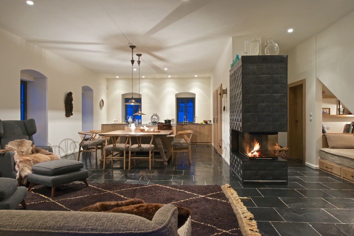 „Došlo k očištění vnitřní dispozice, umožňující velkorysejší zázemí obývací části. Důraz byl kladen na výhledy do okolní krajiny, na propojení s exteriérem. Dispoziční řešení hlavní obytné místnosti a ložnice, bylo podřízeno právě výhledům z oken. Interiér atmosférou připomíná venkovský historický objekt. Nová okna se sníženými okenními parapety, dostatečně prosvětlují místnosti, umožňují větší kontakt s venkovním terénem a svojí formou evokují tradiční stavení,“ vysvětlují architektky. V přízemí a suterénu je použitá šedo-černá kamenná dlažba a na podlahy v ložnicích palubky v dekoru postaršeného dubu. Dveře a většina atypického nábytku je z dubového masivu. V centrální místnosti je navržen průhledový krb, obložený antracitovými kachlemi s cibulovým reliéfem. „Úprava dispozice hlavního obytného prostoru s nikou na lednice a spíží, umožnila vytvořit dostatek úložných prostorů pro kuchyňské zázemí. Nebylo pak nutné zatěžovat místnost objemnými kuchyňskými skříněmi, lednicí s mrazákem a skladem potravin. Obývací prostor tak působí vzdušně a velkoryse,“ pochvalují si. „Koupelny jsou zařízeny konzervativně s odkazem na historizující styl. Navržen je vyzděný sprchový kout, osově umístěná vana s výhledem do krajiny a atypické umyvadlové pulty s kamennou deskou. Sauna a ochlazovací káď se sprchou jsou v suterénu. Díky okolnímu svažitému terénu, je i v této části domu možný kontakt a výstup do okolní krajiny. V okolí domu a na zapraží je použítá stará žulová dlažba. Cílem návrhu bylo vytvoření interiéru, odrážejícího ducha venkovských obydlí s akcentem na výběr a kombinaci současných a původních materiálů. Zásadní byl kontakt s okolní přírodou, dále pak dostatek soukromí a komfortní zázemí, ve kterých mohou obyvatelé trávit čas v širším rodinném kruhu.“