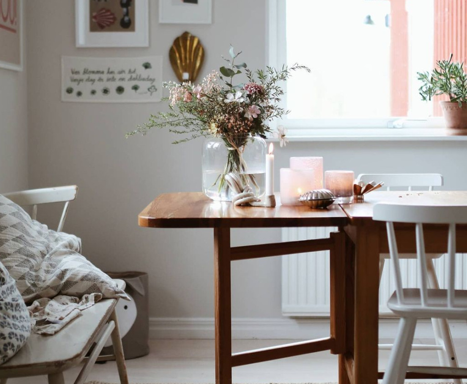 „Líbí se mi typický skandinávský styl, se světlými barvami a světlým borovicovým dřevem. Vedle toho si cením originálních věcí, které nevidíme všude. Miluji nakupování věcí z druhé ruky a vintage předmětů, díky kterým je pak domov útulnější a osobnější.“ V domě najdeme ale i nové věci, které pochází z Ikea, ale také několik klasických švédských a dánských designů, jako je židle Arne Jacobsena „Sjuan“ a křeslo od Bruna Mathssona „Karin“. „Líbí se mi kombinace různých stylů a snažím se o eklektický domov. Chci, aby se náš domov působil uvolněně a ne nějak přehnaně dokonale. Žijeme zde a není to muzeum. Děti mají svou ložnici a hernu, ale stejně jako dospělí žijí v celém domě, takže pokud si chtěli v obýváku postavit bunkr z dek a polštářů, není to problém. Jsem nejšťastnější, když jsme všichni doma s rodinou a přáteli. Pravidelně pořádáme večeře, kterým se ve Švédsku říká „fika“.“ Dům už brzy čekají další změny. Dřív světlé a bílé stěny dostanou barevnější kabátek. „Zdobení interiéru je pro mě jakýsi druh terapie. Když je vnější prostor teplý a hřejivý, je mi dobře i uvnitř.“