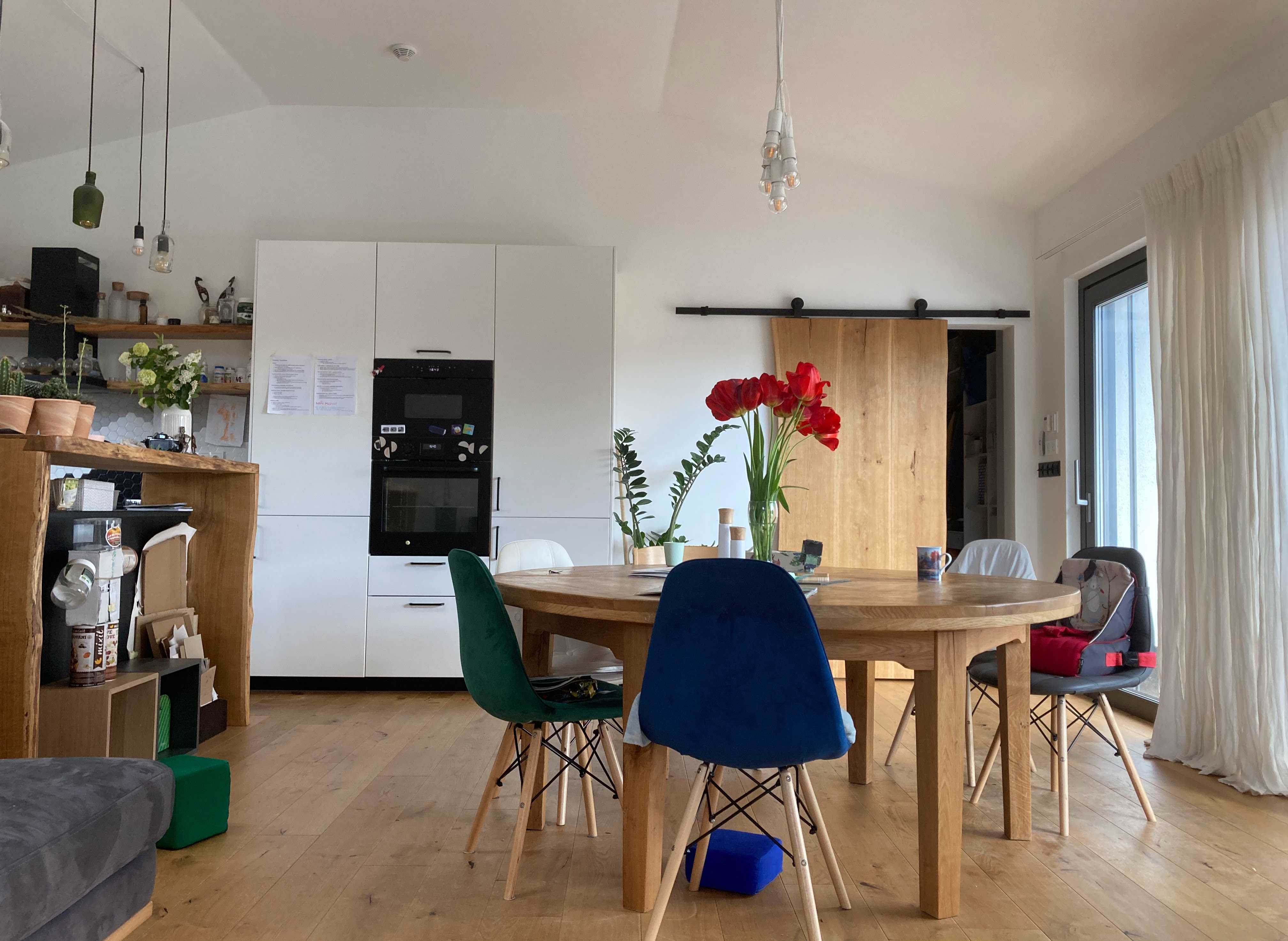 „Jsme oba děti paneláků,“ vypráví majitelka domu Aka. „Sdíleli jsme pokoj se sourozenci, pak i byty s kamarády, a nakonec jsme si chtěli postavit společný cohousingový dům. Sdílenou zahradu, děti pobíhající mezi dveřmi, večerní grilování. Jenže vhodný pozemek jsme nenašli.“ Těsně před založením rodiny se manželé ještě stěhovali na Bořislavku/Hanspaulku, kde původně plánovali zůstat déle. Nakonec ale rozhodl osud. Manžel onemocněl boreliózou a po dlouhé léčbě bylo jasné, že život v Praze mu nesvědčí. „Zrovna prodávali pozemky v jeho rodném městě, tak jsme neváhali. Podepsali jsme smlouvu a pustili se do stavby.“ Dům rostl pod vedením manželova otce. Aby ušetřili, vzdali se pronájmu a stěhovali se po rodině, po bytech, po garážích. „Věci jsme měli všude. Dodnes nechápu, že se nám je podařilo dát dohromady.“ Hrubá stavba byla hotová právě ve chvíli, kdy přišel covid a s ním i lockdown.