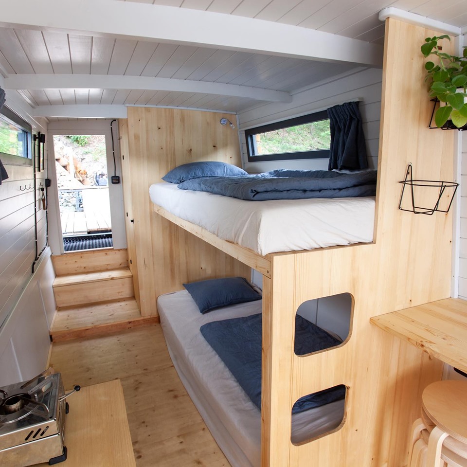 Interiér je celý obložen dřevem. Velká okna sem pouštějí dost světla, proto i malý prostor působí vzdušně.