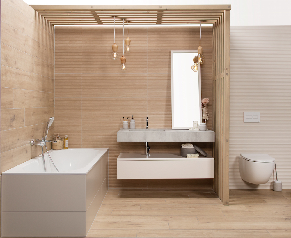 Dekor dřeva ve světlých neutrálních odstínech působí měkce, zabydleně a domácky. Kolekce Dřevěná koupelna, Siko