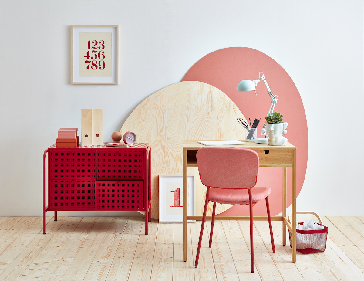 Červená barevná kombinace by měla probouzet energii a chuť do práce. Hodí se spíše pro studentku či pracující ženu. Minimalistický interiér nechává vyniknout přírodní strukturu dřeva na podlaze a pracovním stole. Atmosféru pak doplňují syté barevné prvky s výrazně natřenou komodou a trendy růžovoměděným odstínem. Foto: Balakryl UNI