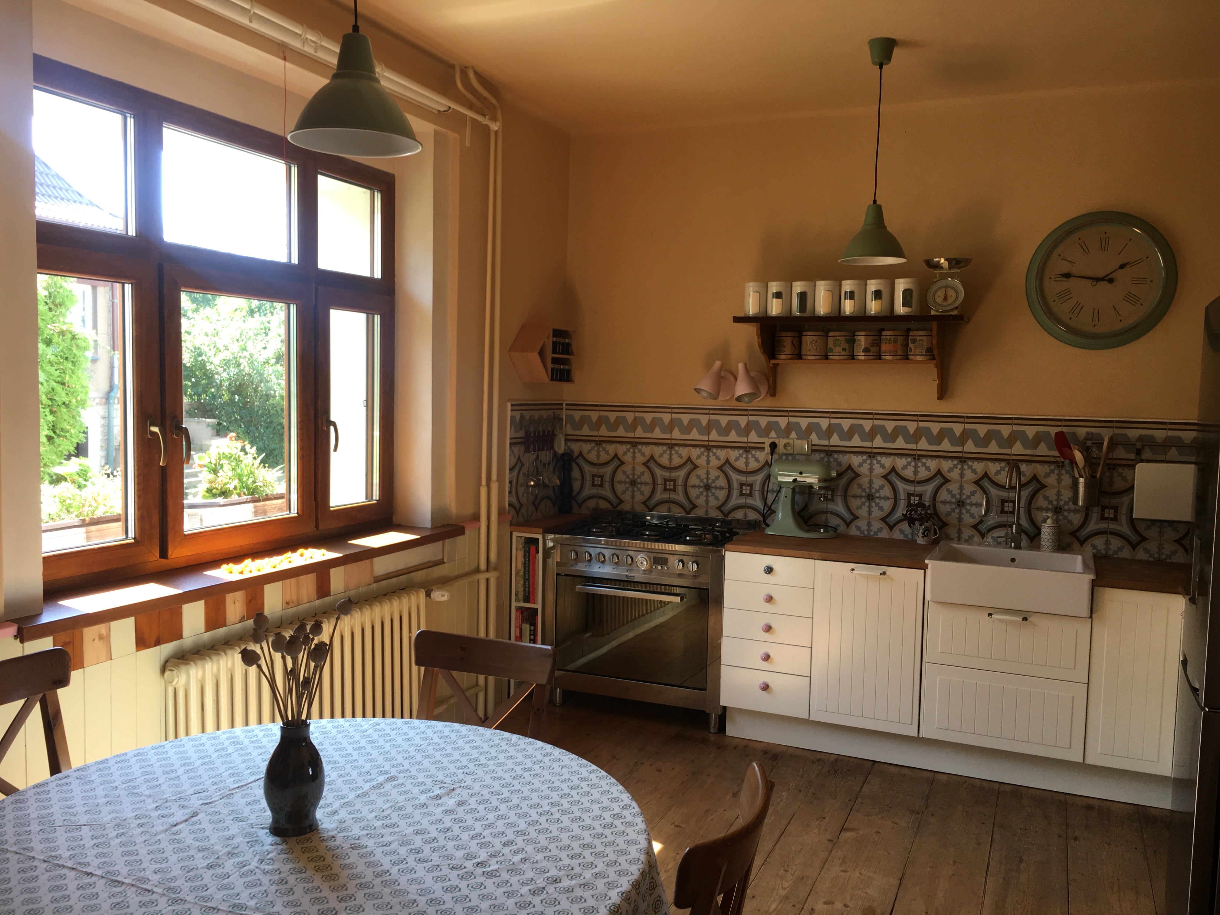 Je zde jeden moment, který se týká stylu. Část, která je na straně lednice je více styl první republiky, ale styl na opačné straně mi přijde jako „padesátkový“ a je tam málo pojících doplňků, dekorací. Z fotografií to nepůsobí celistvě, ta tapeta z fotek vypadající jako malinové puntíky příliš nesedí se stylem, který do kuchyně vnesly obklady nad linkou (náprava viz výše).