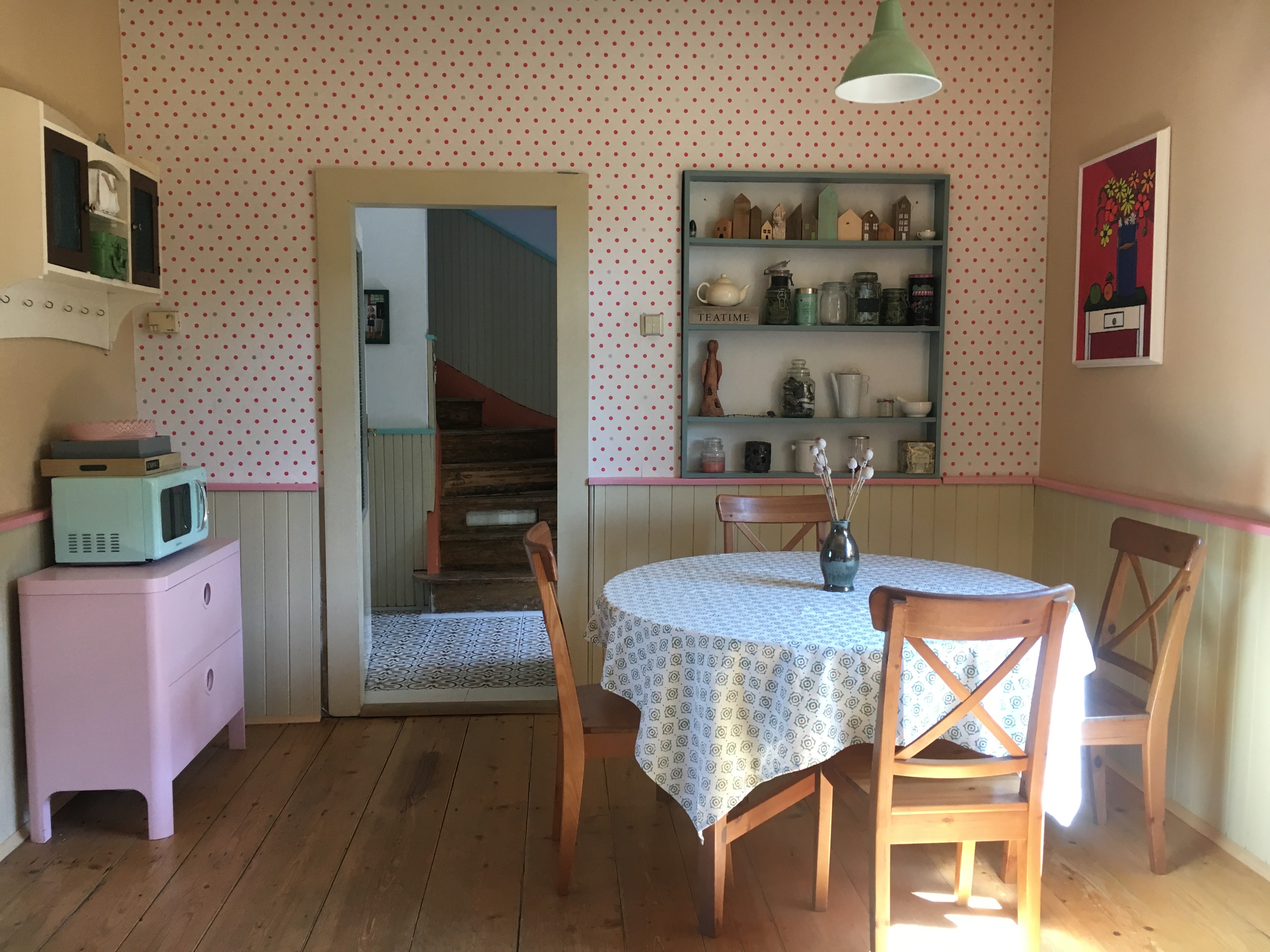 Růžová komoda s mikrovlnnou troubou ve stylu „padesátek“ je možná něco, co se nám líbí, ale stylově se sem moc nehodí. To nemusí vadit, ale rozměrově koutek působí, jako by potřeboval něco doplnit. Možná bych místo růžové komody dala jednoduchý rozměrnější konzolový stolek nebo starou komodu s mramorovou horní deskou, které v kuchyních té doby bývaly.