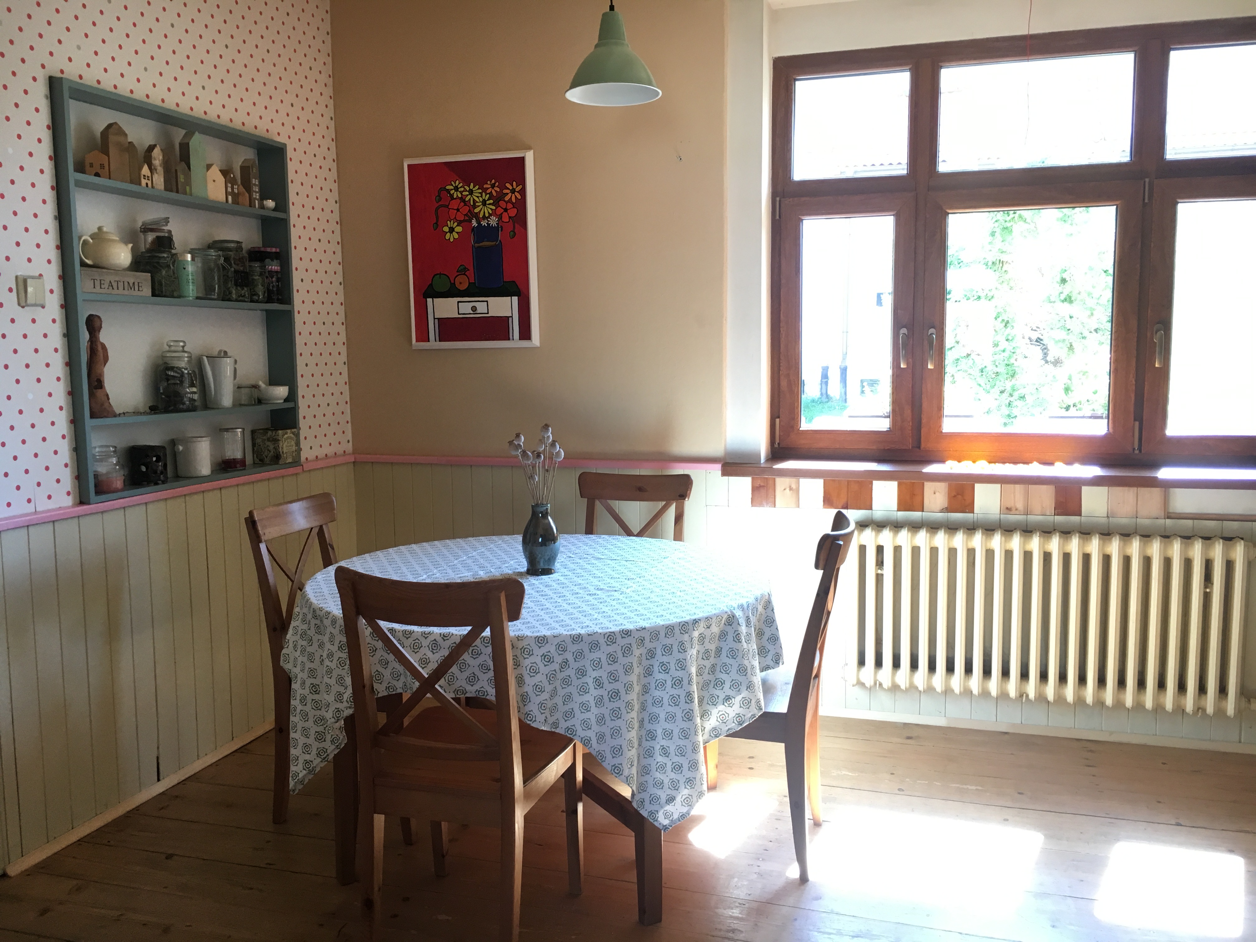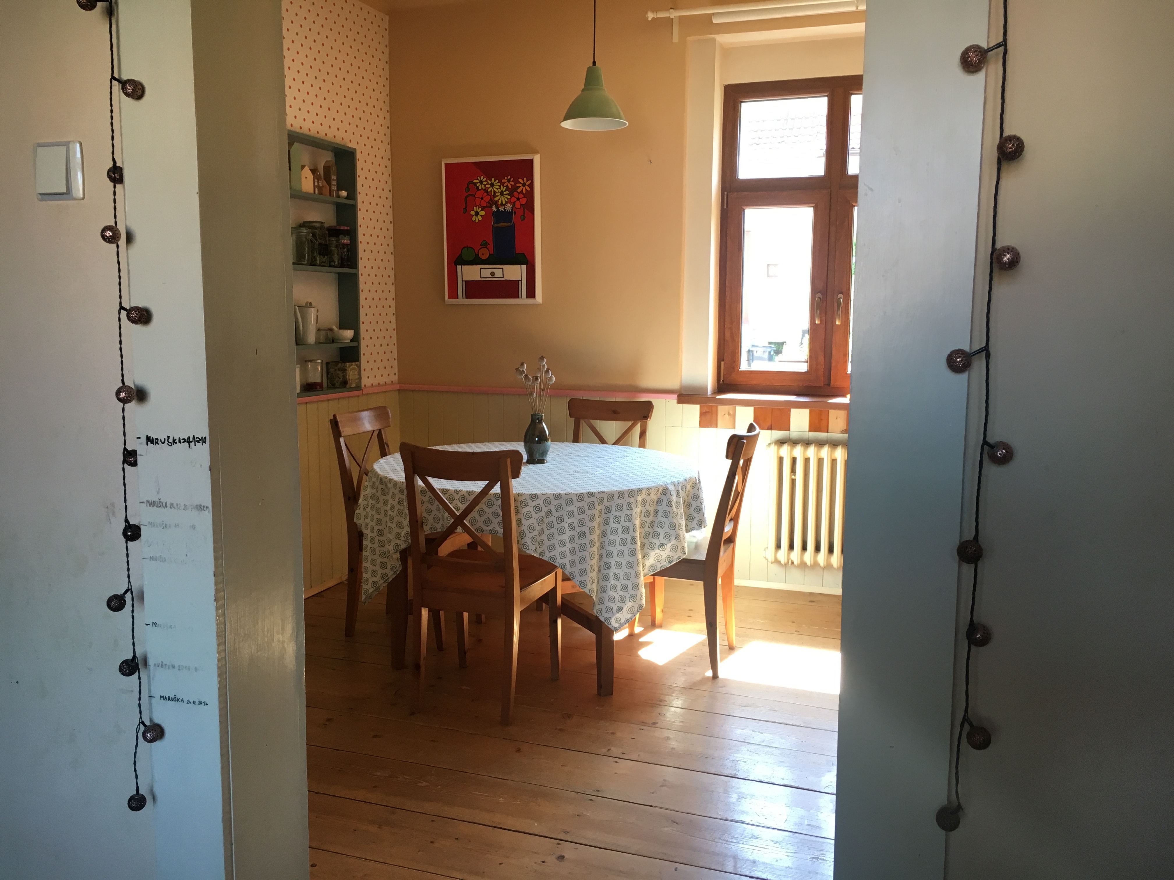 Namísto zelené police vsazené do zdi u stolu, bych k této stěně navrhla doplnit jednu nebo dvě dlouhé kuchyňské prosklené skříňky cca i 200 centimetrů, ve stylu kuchyňských skříněk, například bílé mřížkové. Důvodem je vytvořit něco jako kotvu pro posazení jídelního koutu a zároveň v celé místnosti vyvážit hmotu nábytku vlevo od vstupu a vpravo od vstupu. Obraz bych umístila na stejnou zeď, ale na střed mezi okno a nové dlouhé skříňky.