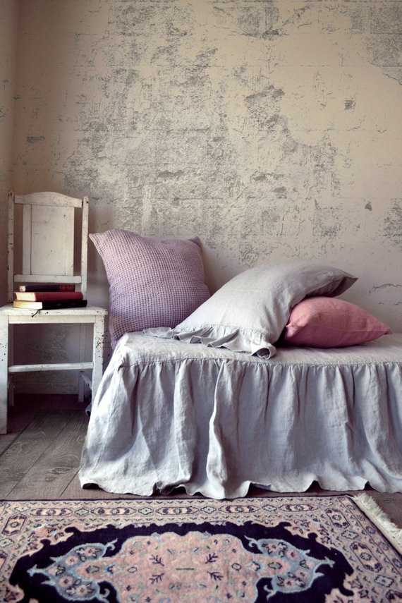 Když už jsme se do tématu pustili, představíme vám tento specifický typ ložního prádla ve větší šíři. Začněme tedy onou sukní, v originále někdy psanou i dohromady jako 'bedskirt'. Bohatá nebo pouze s jednoduchými sklady se vkládá mezi spodní matraci pevně usazenou v rámu a volnou horní. V tom případě může být horní strana nepohledová, slouží jen k nesení volánu a není vidět. Té se v originále správně říká 'valace'. Většina z nás ovšem spí na posteli s jednou matrací, 'bed skirt' pak funguje jako prostěradlo a je celé ze stejného materiálu. Koupíte ho samostatně, ale také jako v setu, a to buďto ve složení spodní a vrchní prostěradlo plus povlak na polštář, nebo jako prostěradlo, povlak na peřinu a povlak na polštář. Proč dvě prostěradla? To horní nahrazuje zmíněný povlak na peřinu a podkládá se pod nepovlečenou deku – řešení, které my středoevropané známe z spíše z hotelů, v našich domácnostech nemá historický základ. Poslední variantou je přehoz s volány. Obejme postel stejně jako jeho prostěradlová verze, slouží ale místo ke spaní k úpravě lůžka přes den.