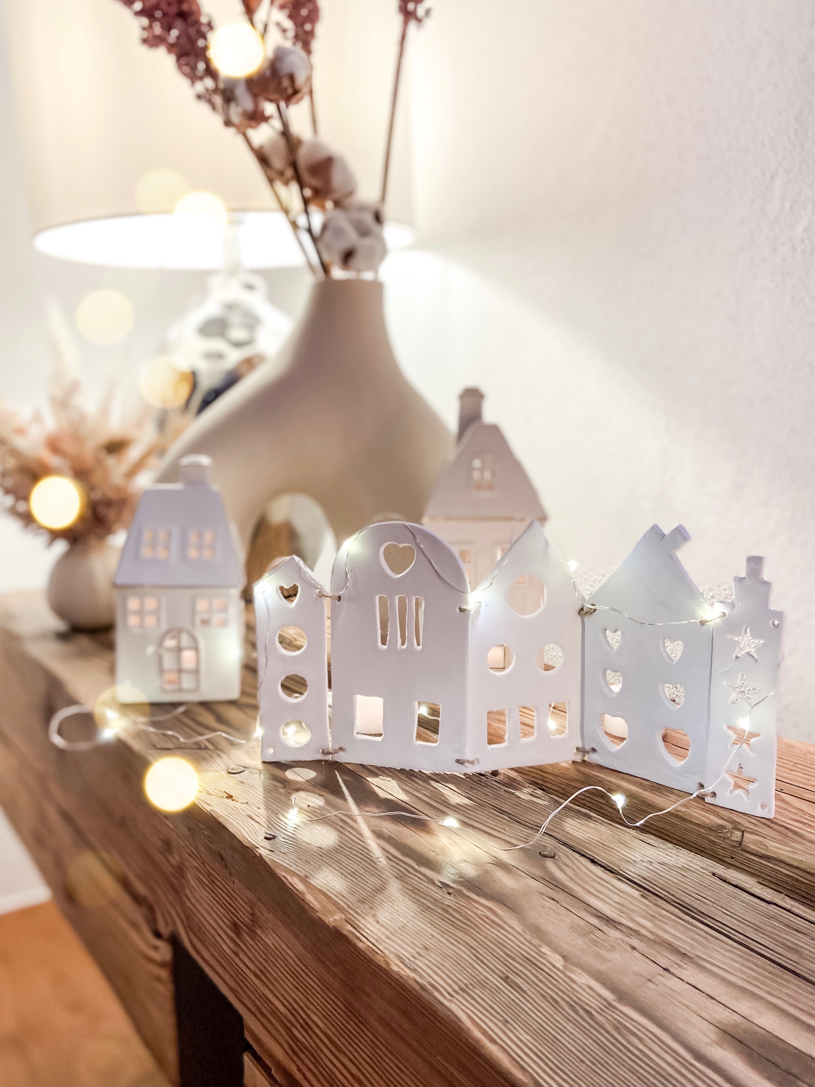 Postup je víc než snadný. Po krátkém hnětení se stává modelovací hmota měkkou a poddajnou a lze ji lehce modelovat pomocí válečku, nožíku, formiček nebo strojku na nudle. Vyválejte si z ní plát o stejné tloušťce cca 0,5 cm. Pomocí nože nebo kuchyňské špachtle si vyřezejte jednotlivé domečky a pomocí vykrajovátek na cukroví vyrobte jednotlivá okénka. Nezapomeňte po stranách vytvořit pomocí špejle otvory, kterými pak protáhnete provázek a jednotlivé domečky k sobě přivážete. Hotový výrobek se peče v troubě při teplotě 110 stupňů Celsia po dobu 20-30 minut, nebo se vaří ve vodě po dobu 20 minut. Po vychladnutí můžete domečky přelakovat, budou pak připomínat porcelán. Dozdobit je můžete světelnými řetězy, nebo za ně rozmístit čajové svíčky. Výhodou těchto domků je, že je lze snadno složíte jako harmoniku a zabírají minimum místa.