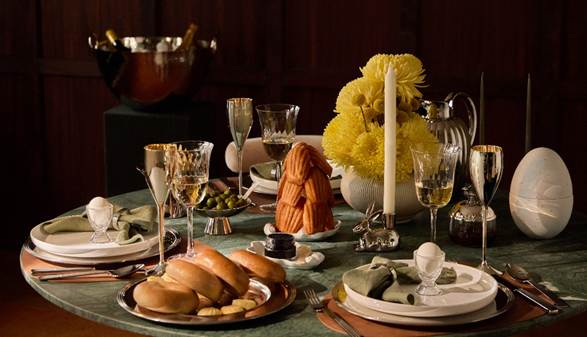 Zapomeňte na obyčejně složené ubrousky. Zaměřte se na detaily, a právě ubrousky složené do tvaru mašlí či s elegantními kroužky dodají stolování špetku aristokratické hravosti. Použití texturovaných látek nebo jemných vzorů v neutrálních tónech podtrhne elegantní vzhled celého stolu. Jedním z dominantních prvků tohoto stylu je foukané sklo. Investujte do ručně foukaných sklenic s jemnými detaily, které dodají stolování osobitý charakter. Takto by se mohlo zdát, že stůl působí příliš stroze. Proto ho doplňte svěžími květinami. Velké květy, jako jsou chryzantémy nebo pivoňky, v kombinaci s jemnými zelenými větvičkami perfektně vyváží chladnější tóny kovu a skla.