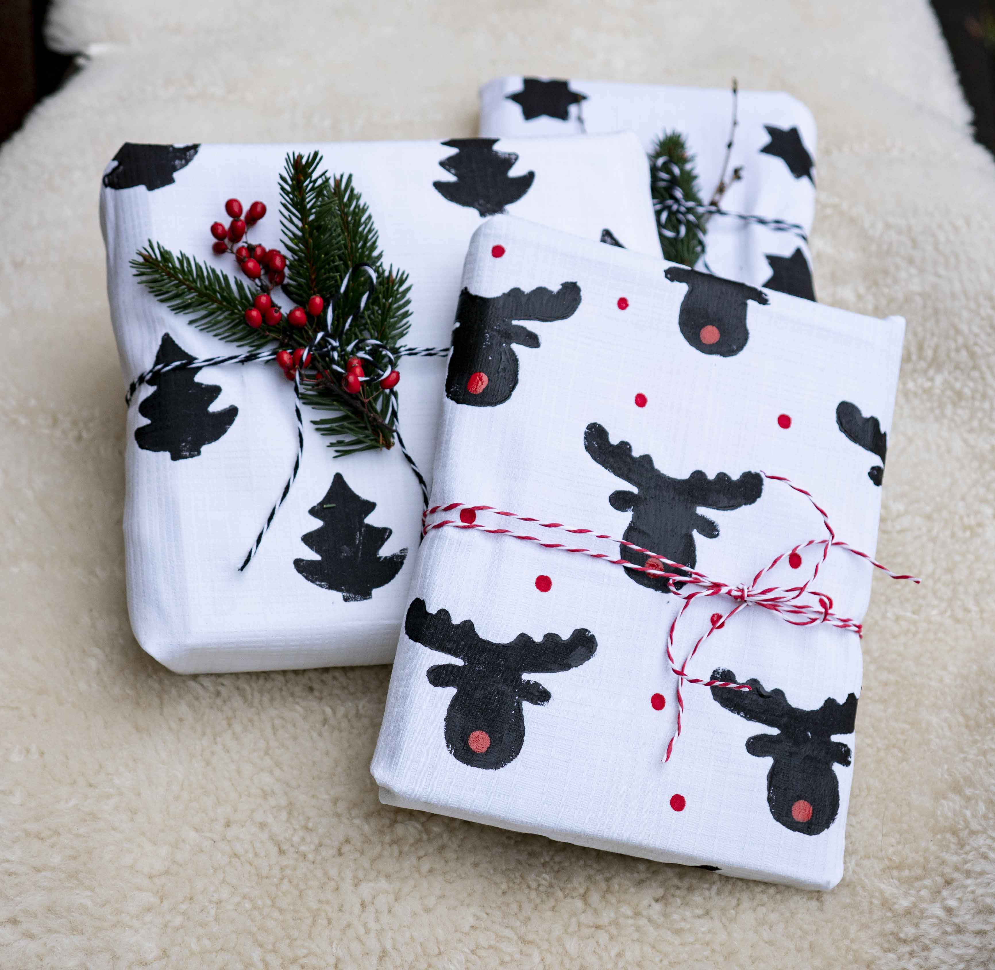 Na detaily, jako je například sobí nos, můžete použít tenký štětec nebo kosmetickou tyčinku. Do uschlé a vyžehlené látky pak dárky balte stejně jako do papíru, jen zahnuté kraje nepřilepujte lepicí páskou, ale převažte je provázkem nebo stuhou.