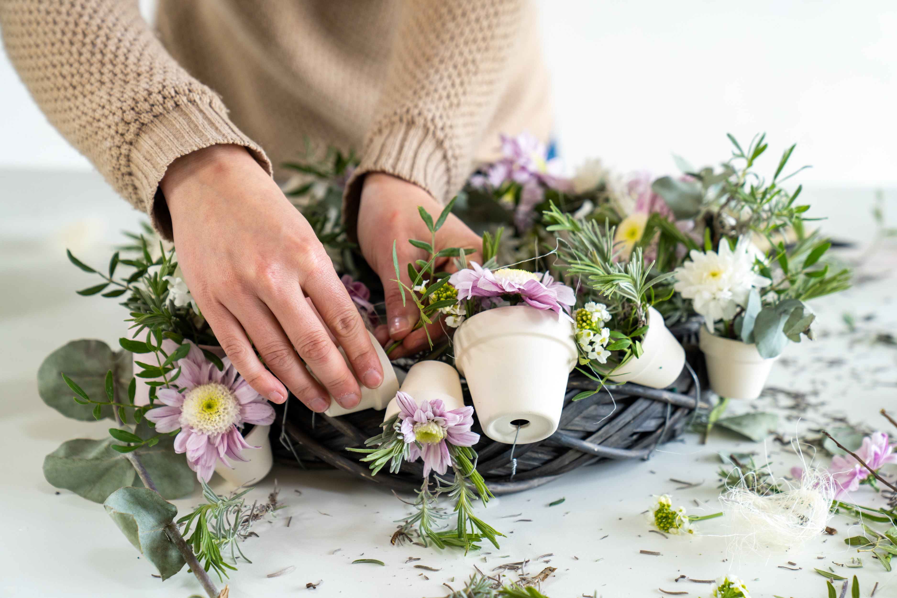 Aranžovací hmotu ponořte do vody a nechte nasáknout. Poté z ní odkrajujte menší kousky, kterými naplňte všechny květináče. Mokrou hmotu lze rukama tvarovat, takže ji snadno přizpůsobíte požadované velikosti. Pak do ní zapichujte květiny či jiné přírodniny. S dekorováním si dejte záležet a rostlinami rozhodně nešetřete – věnec by měl být co nejbohatší! Jakmile budete s výsledkem spokojeni, přidejte po okraj ještě trochu kokosového vlákna, které pomůže zcela zakrýt nevzhlednou aranžovací hmotu. Vlákno seženete v květinářství nebo výtvarných potřebách, v přírodní variantě i v různých barevných provedeních. Pak už nezbývá než věnec zavěsit na dveře a vyhlížet příchod jara.