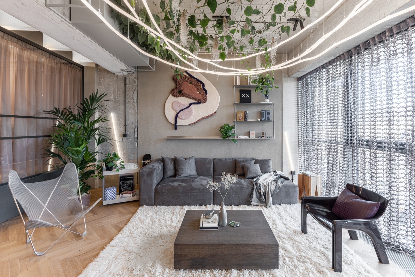 Omezená světlá výška bytu (2,8 m) vyloučila vestavbu patra, a tak bylo třeba pracovat chytře s každým centimetrem. Výsledkem jsou důmyslná řešení jako výsuvné úložné šuplíky pod podiem ložnice, pracovní stůl skrytý v nábytkové stěně nebo prostor pro robotický vysavač zabudovaný do skříně. Prostor působí vzdušně i díky zavěšenému nábytku a zapuštěným soklům s kouřovým zrcadlem. Skleněná příčka oddělující ložnici nechává procházet světlo a přispívá k celkové otevřenosti. Charakter celého interiéru definují přírodní materiály (dřevo, kámen, textilie) v kontrastu s kovem a designovými solitéry. Nechybí ani autorská tapisérie od Bohemian Rugstory, vytvořená na míru. Loft tak doslova dýchá osobností své majitelky – sebevědomé, praktické a se slabostí pro vše, co se probouzí až po setmění.