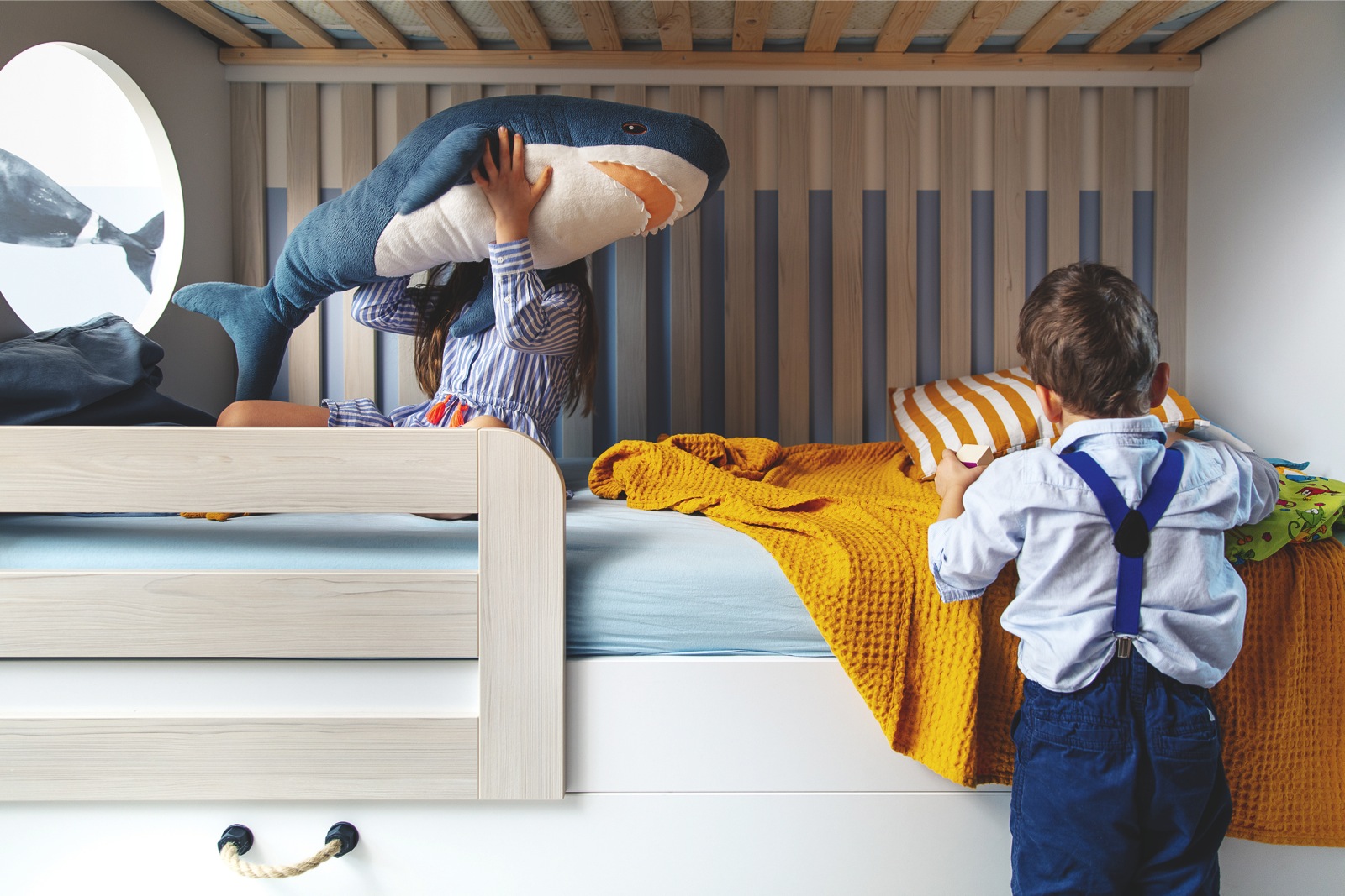 „Nová palanda s dostatkem úložného prostoru umožnila vytvořit v pokojíku ještě malý hrací koutek, kde si děti můžou vytahovat knížky z poliček a rovnou se s nimi uvelebit na huňatý koberec. Dětem jsem sem dala ještě houpačku, která se dá kdykoli sundat,“ říká designérka Romana. „Jak stůl Tea, tak Nelin nemají nohy. Desky jsou namontované přímo na zeď a k bočním stěnám ostatního nábytku. Lépe se pod nimi gruntuje a v pokojíku je tak i více volného místa. Až budou děti větší, můžou se desky přimontovat výše. Šestiletá Nela na svém stole ráda kreslí, proto jsem nad něj umístila nástěnku, kde si může vystavovat svá dílka. Teo je pořád ještě dost malý, takže svůj stolek používá spíše jako opičí dráhu. Přímo totiž navazuje na postel s kulatým okénkem, jímž může prolézat sem a tam. Všechny šuplíky, jak u stolu, tak postele, mají úchytky z lana. Tenhle drobný prvek hezky podtrhl celkový dojem mořského světa. Modrá na zdech evokuje hladinu moře, z níž vyskakují delfíni a velryby.“