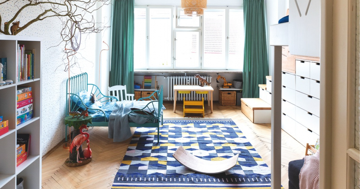 „Irena měla o pokojíku lehce romantickou představu. Chtěla pro děti na míru vyrobená dřevěná doupata zatažená sametovými závěsy, která mně osobně v duchu evokovala bradavické školní postele z Harryho Pottera. Prostor je ale příliš malý a s takovými kójemi by připomínal spíše nocování na letním táboře. Irena s Willem nakonec souhlasili s krytým spaním pouze pro Benjamina a já do jeho domečku ještě zakomponovala úložné prostory. Bohužel se vešel jen jeden psací stůl, takže druhý je vysouvací a schovává se pod knihovnou dělící obě lůžka,“ říká designérka. Nepraktickou mezeru Jana kompenzovala nástěnnou opěrou z překližky s mini parapetem nahoře. Do opěrky nechala vyvrtat dírky, které pak s pomocí Ireny a Annabel propletla různými barevnými stužkami a gumičkami z galanterie.