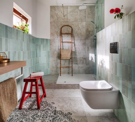 „Irena s Helenou si vybraly tři typy modrých obkladů a spolu jsme pak zvolily finální ve dvou různých rozměrech – úzký je na stěnách a čtvercový za sprchovou baterií. Obklad jsme doplnily šedou dlažbou, u sprchy vytaženou až na stěnu. Krajkový motiv na podlaze vypadá lehounce punkově, což se mi líbí, a dlouhou úzkou koupelnu krásně opticky rozbíjí. Rozmístění sanity ani zařízení se neměnilo, ale vše je nové. Sádrokartonové podhledy schovaly elektrické rozvody a odvětrání a sprchový kout má stupínek, protože nebylo možné vysekat spádování. Do soklu se ale skvěle skryla,střeva‘ odtoků. Být to na mně, místo zrcadlové skříňky bych dala nějaké odvázané zrcadlo se zlatým rámem, já na ty skříňky moc nejsem, ale respektuji vždy klienta. Tak jsme vybrali aspoň šik skleněné vypínače. Hlavně že holky jsou spokojené!“ Uzavírá designérka Pavla Kirschner.