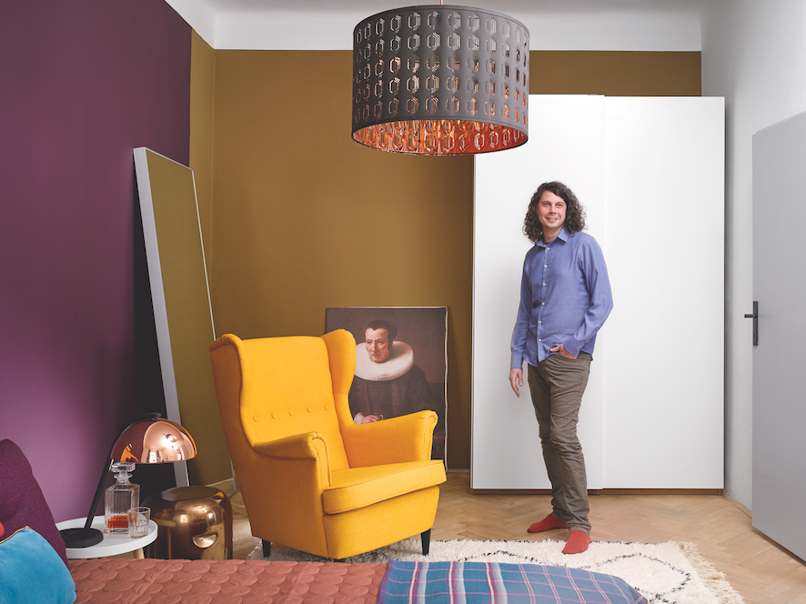 Honza převzal byt od kamarádky, která v něm pobývala jen občas. Podle toho vypadala i ložnice. Žádné skříně, jen bílé holé stěny a provizorní spaní. První z věcí, které si pořídil, byla postel, s úložnými prostory, barevností a dispozicí si ale nechal poradit. Podmínkou ovšem bylo hořčicové křeslo, od něhož se celá proměna odvíjela. Zářivou barvu křesla designérka Janka Murínová podpořila elegantní hnědozlatou a fialovou výmalbou. Oba odstíny vytvořily z ložnice příjemné místo na spaní i odpočinek během dne. S Honzou vybrali velkou šatní skříň a komodu. Pokoj Janka oživila metalickými doplňky, stylovými polštáři, moderním designem a uměním.