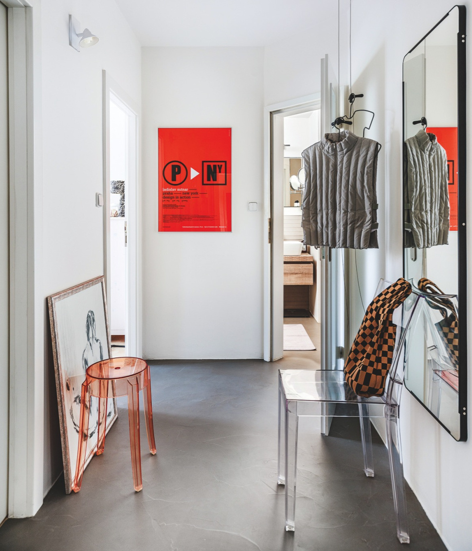 Předsíň má stejnou podlahu jako koupelna: šedo-béžovou betonovou stěrku. „Většinu dne nechávám dveře do koupelny otevřené. Líbí se mi, jak se opticky zvětší prostor a na obě místnosti je radost pohledět,“ říká Marie, které nikdo neřekne jinak než Majka. Jak proměna proběhla?