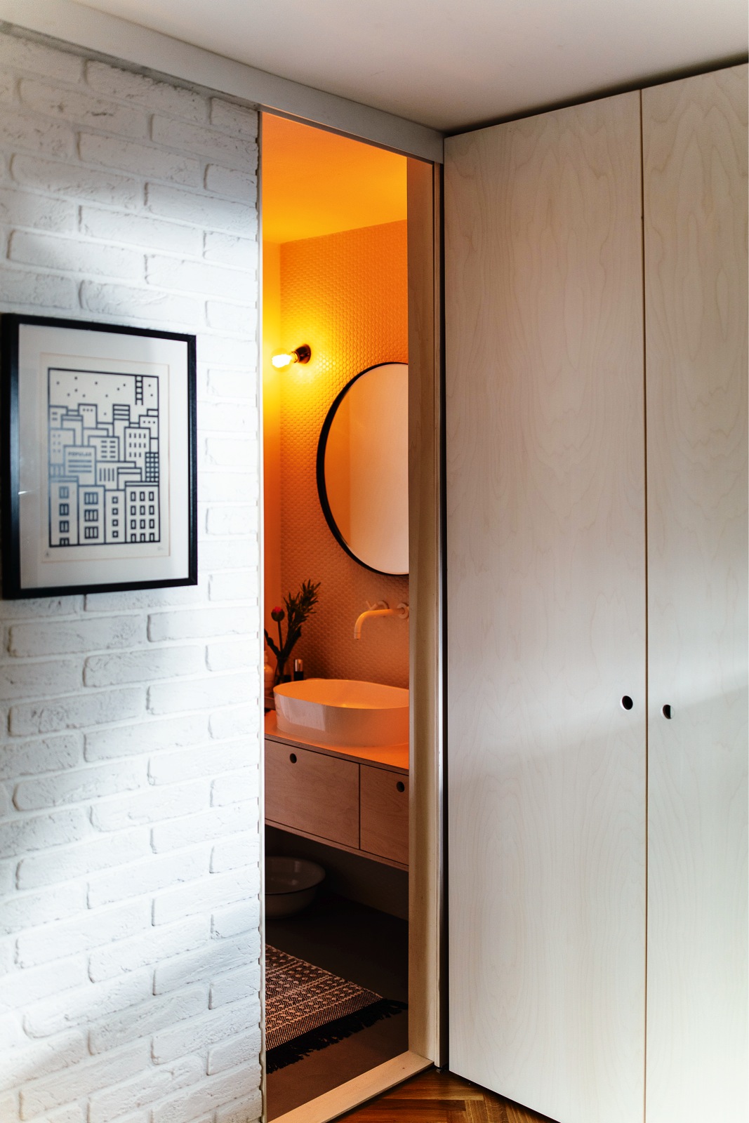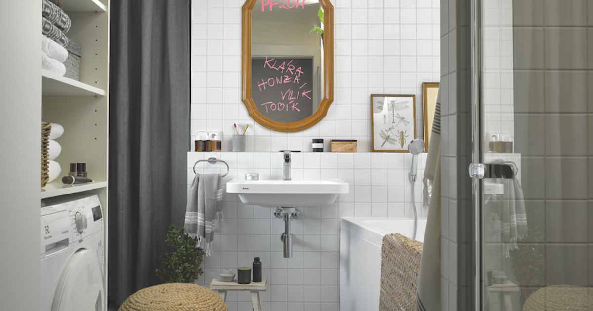 Vanu Andrea nahradila walk-in sprchovým koutem a umyvadlo přesunula na protější stěnu. Díky těmto změnám působí koupelna i s menší dispozicí prostorným dojmem a pohodlně se do ní vejde třeba topný žebřík určený nejen na sušení ručníků. Překližka v kombinaci se stěrkou a výmalbou dobře funguje i na sousedícím záchodě. Za dřevotřískovou stěnou dnes najdeme schované poličky, které ukryjí ruličky toaletního papíru i další nezbytnosti. Topení, které tu bylo, natřela Andrea, stejně jako jinde v bytě, černou barvou. Na podlaze kromě stylového toaletního kartáče nic nestojí, takže se tu dobře uklízí. Obklad stěny za umyvadlem a ve sprchovém koutě tvoří puntíkatý rastr. Designérka si ho vybrala především kvůli hravosti a také jemné struktuře. Je vytažený až do stropu, stejně jako zástěna před sprchou, a tím, že zabírá celou možnou plochu, místnost opticky sjednocuje. Kdo tvrdí, že si nikdy nečetl na záchodě, ten to jistě dělá každý den. Andrea tu má dost místa nejen na tlustší tiskoviny, do šanonu se dobře vejdou i Oliverovy časopisy. Na zemi by ovšem mohl stojan překážet a znesnadňovat úklid, proto je v pohodlné výšce zavěšený na stěně vedle záchodové mísy. Velké osušky se tady budou sušit na topném žebříku, ale menší ručník je přece jen šikovnější mít hned po ruce. Aby nijak nenarušoval ozdobnou plochu skříňky, je jeho místo na kulatém držáku kousek vedle umyvadla. Dobře se na něj věší a je snadno k dosažení prakticky z celé koupelny. Tajným receptem na malou koupelnu je mobilita. Proto do ní Andrea přidala stoličku, kterou je možné v případě potřeby odstavit do sprchového koutu. Na skříňce pod umyvadlem je zase miska z litého betonu. Tam se odkládají drobnosti, a pokud by překážely nebo se uklízelo, je možné ji rychle posunout jinam. Přesně po těchto bílých bateriích toužila Andrea dlouho, a když se jí poštěstilo sehnat je s velkou slevou z expozice, určily ráz celé koupelny. Stejná baterie je teď ve sprchovém koutu i nad umyvadlem. Nerez by se tu zbytečně leskl, ale bílý matný povrch vystupuje z obložené zdi, aniž by ji opticky narušil. Tkaný kobereček se na podlaze koupelny hodí, zvlášť v chladnějších měsících. Ráno je přece jen příjemnější postavit se na něj než na holou zem. Díky velikosti není problém ho podle potřeby v koupelně posouvat, a kdyby se náhodou časem ušpinil, strčí ho majitelka jednoduše do pračky.