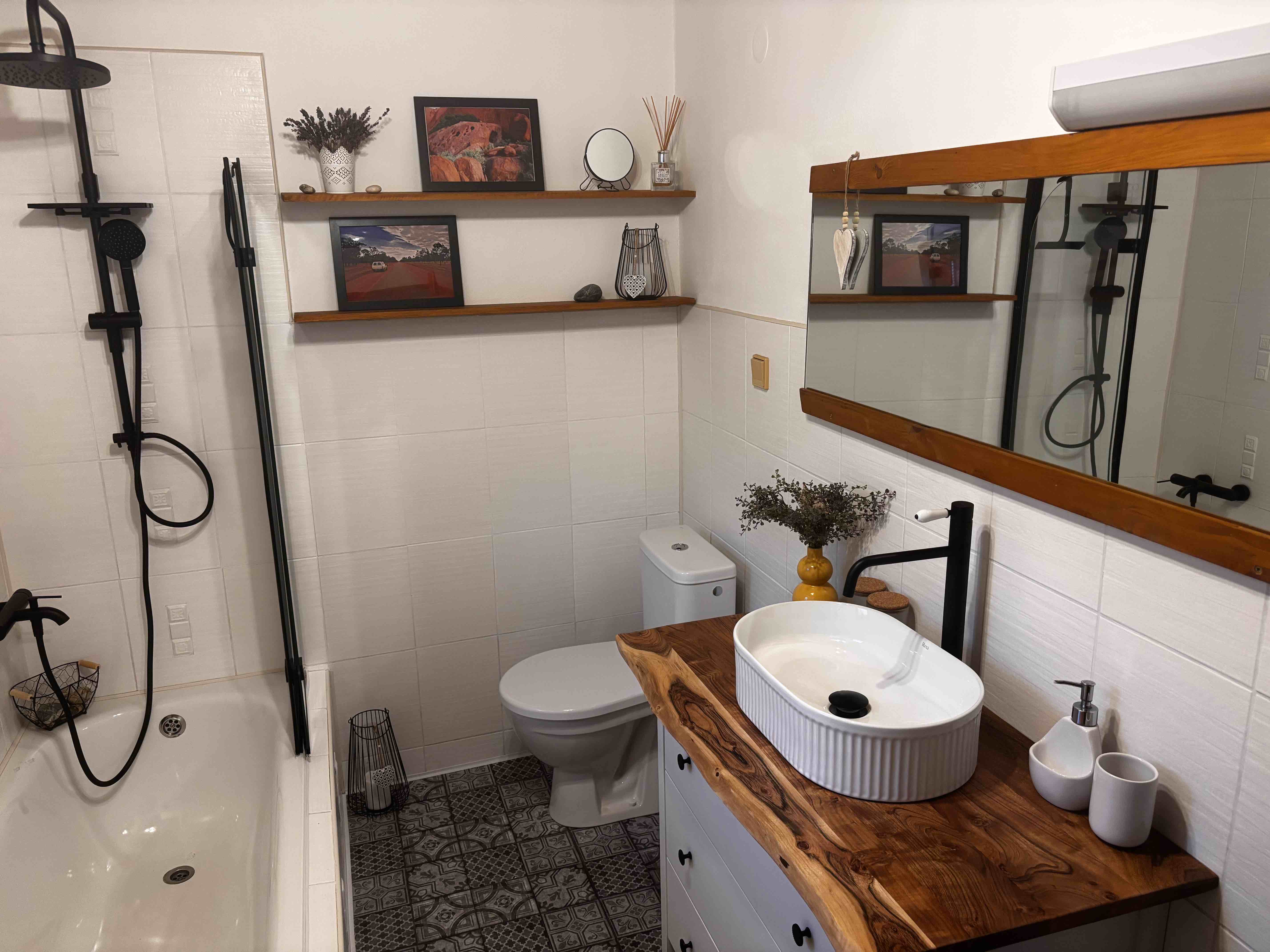 Klíčovým prvkem nové koupelny se stala stará dřevěná komoda. „Když jsem ji dostala, hned jsem věděla, že z ní udělám skříňku pod umyvadlo,“ vzpomíná. Nejdřív bylo nutné zmenšit hloubku dvou šuplíků kvůli odpadu, poté komodu důkladně obrousila, odmastila přípravkem ProGold a natřela nátěrem Bonding Primer pro lepší přilnavost barvy. Finální vrstvu tvořila už zmiňovaná barva Rust-Oleum Kitchen Cupboard Paint Barva: Antique White/ bílá antik. Horní desku nahradila masivní deskou z akáciového dřeva, kterou koupila jako krycí desku z e-shopu vidaXL. Umyvadlo zvolila keramické, bílé, oválné, model Rea Vanda, doplněné černou matnou baterií Rea Serra Black. „Vrtání otvoru pro odpad byl asi největší boj. Akácie je tvrdé dřevo a můj vrták to nezvládal. Nakonec mi pomohl bratr a půjčil mi kvalitní sukovník, o kterém jsem do té doby ani nevěděla,“ směje se. Původní vana měla jen ruční sprchu, což nebylo příliš praktické. Nejdříve zvažovala levnější závěs, ale nakonec se rozhodla pro elegantnější řešení, skleněnou zástěnu EMKE s nano povlakem v černém rámu. „Byla těžká, tak jsem musela povolat manžela. Bála jsem se vrtat do obkladů, ale nakonec vše zvládl s pomocí speciálního vrtáku do keramiky,“ popisuje. Novinkou je také dešťová sprcha KOLUMNA, kterou bylo možné připojit přímo na původní baterii. „Chtěla jsem, aby se dalo pohodlně osprchovat, a tohle řešení bylo ideální.“