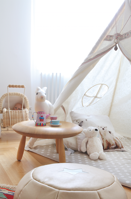 Na zdech se objevují autorské ilustrace zvířat a mytických symbolů z celé planety, které na míru navrhla výtvarnice Barbora Zachovalová. Zařízení pokoje naznačuje i lásku k tradičním řemeslům a poctivým materiálům. Výchozím prvkem, který určil pokojíčku styl a barevnost, byl ručně tkaný koberec z Turecka: „Je asi čtyřicet let starý. Nebyl nejlevnější, ale věřím, že když vydržel doteď, přežije i Medino řádění,“ směje se Eva. Stejně jako v jejím obchůdku je i pro ni důležitý kontakt s autentickými materiály, jako jsou vlna nebo dřevo. U Urbanů tak mají své místo také věci z druhé ruky, pro které si nejraději jezdí do antiku Spomyšl, kde myslí i na děti. „Dají se tu najít kouzelné kousky z Francie, které mohou udělat ještě hodně radosti,“ popisuje své oblíbené místo Eva. Předtím, než se tak malá Meda podívá poprvé za hranice, jako by za nimi už dávno byla.