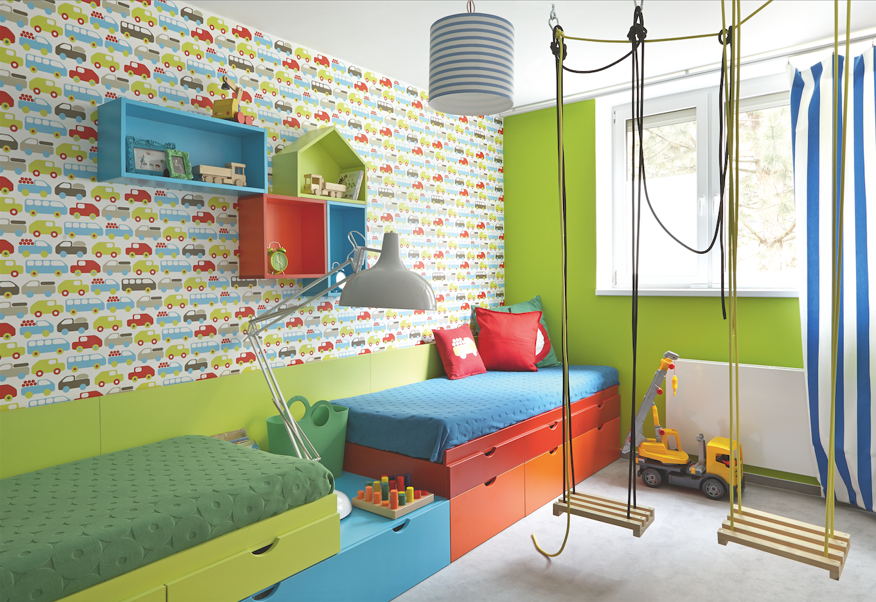 Dvojčata ještě donedávna spala se svými rodiči v ložnici, teď už je jim ale tři a půl roku a to už je přece věk, kdy mají velcí kluci nárok na svůj vlastní pokojíček. Menší zádrhel byl ale v tom, jak do malého prostoru umístit dvě postele, úložný prostor, a ještě tu zbylo dost místa na klučičí řádění. Největším přáním jejich maminky Zdeňky Mynářové bylo, aby pokoj působil symetricky a kluci měli preventivně všechno stejné – jen barevně odlišené. Úkolu se zhostila naše designérka Janka Murínová a doporučila nechat postele vyrobit na míru rovnou i s úložnými zásuvkami. Další úsporu místa vyřešila i vestavěná skříň u okna, která vznikla v místě průchozí šatny. Ta byla rozdělena příčkou na dvě části – jedna slouží klukům a druhá z opačné strany rodičům. Protože Matyáš zbožňuje červenou a modrou a Šimon zase oranžovou a zelenou, volba barev v pokojíku byla předem daná. Do jejích spárů tak padly nejen postele, ale i výmalba a doplňky, které navíc oživila tapeta s pestrobarevnými autíčky. Pokoj se propojil a připravil na pořádné klučičí řádění!