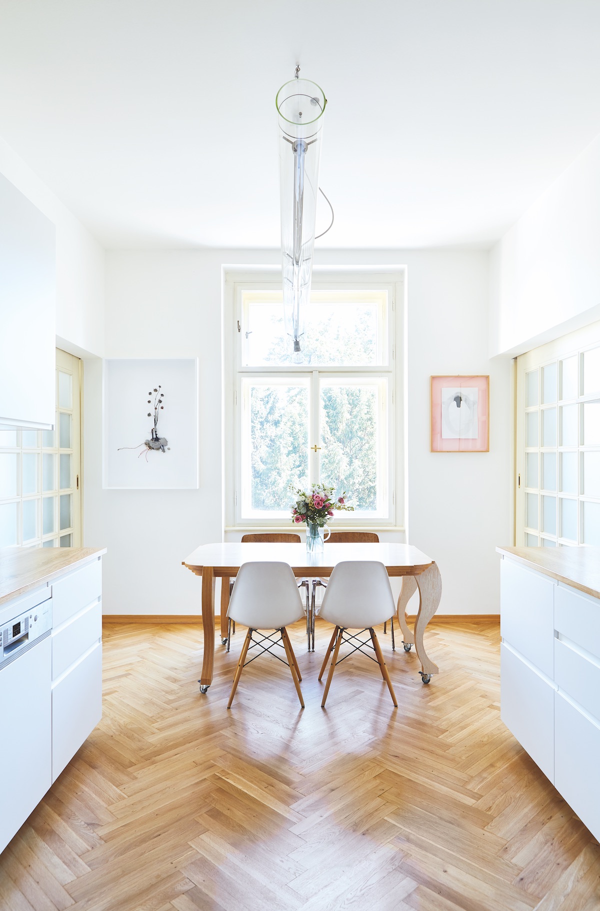 Nájemní byt s pěti místnostmi, vysokými stropy, zachovalými parketami a výhledem do zeleně byl pro Martinu a jejího manžela Honzu splněným snem. Nastěhovali se sem teprve před pár měsíci a už si svůj nový domov v Praze, blízko stanice Hradčanská vypiplali k dokonalosti. Hlavně Honza našel důstojná místa pro své obrazy a díla od významných designérů. Rekonstrukci kuchyně si nechali na konec. „Linka byla funkční, měla i veškeré vestavěné spotřebiče včetně myčky, ale nevyhovovala nám ani vzhledově, ani dispozičně. Kvůli ostrůvku do tvaru L se do místnosti nevešel jídelní stůl – předchozí nájemníci ho proto měli jinde. To nám přišlo zbytečné, chtěli jsme vařit a jíst na jednom místě,“ říká Martina.